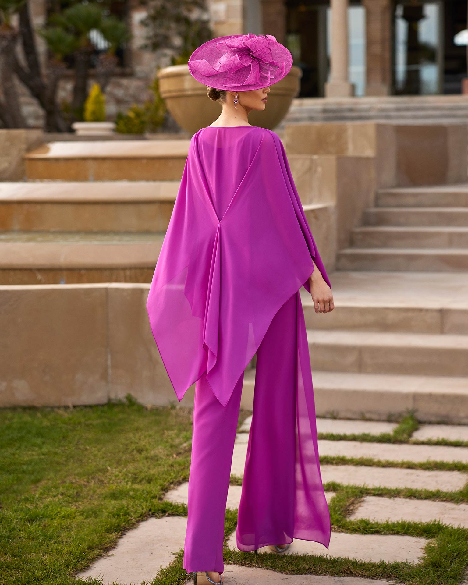 Three-piece trouser suit crafted in chiffon. square neckline, closed back, straps and short cape with flower deatil. A Couture Club outfit.