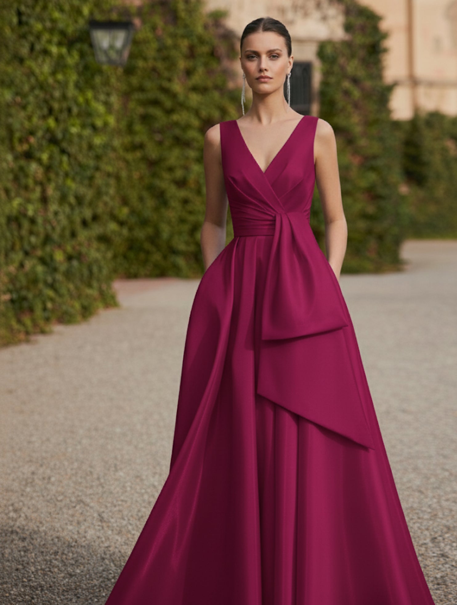 This elegant evening dress from Marfil Barcelona features a luxurious satin fabric with a flattering V-neckline and V-back design. The addition of straps provides comfort and support, while the decorative bow at the waist adds a touch of femininity. Complete with pockets for practicality, this dress is perfect for a formal occasion.
