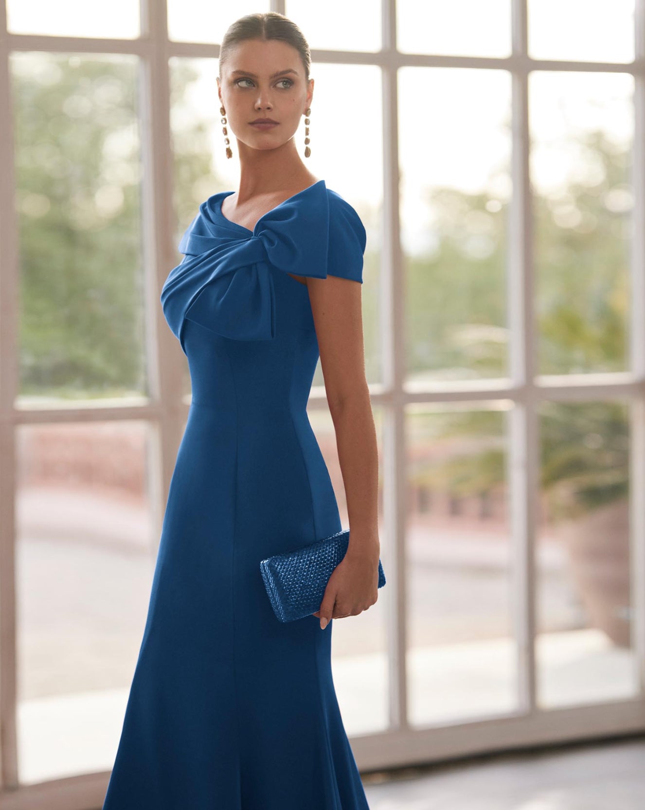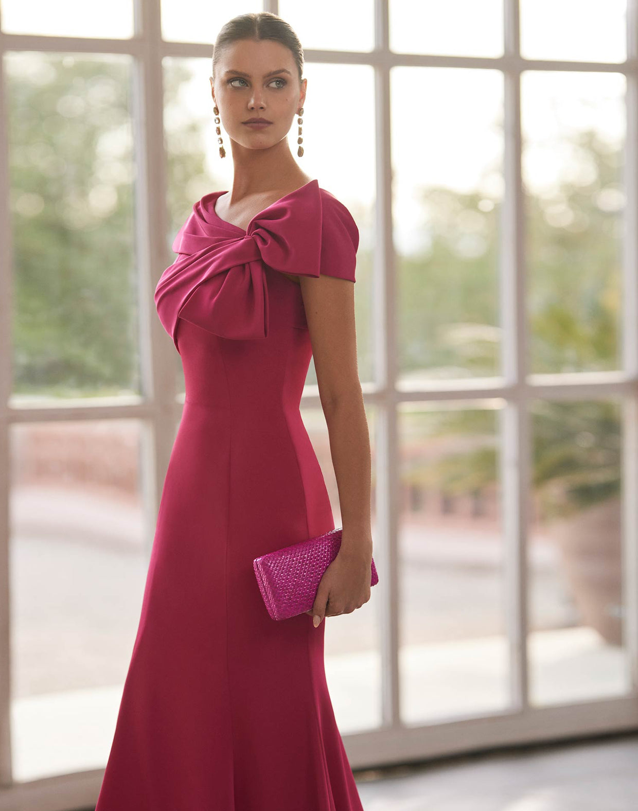 Elegant fuchsia evening gown crafted from smooth satin fabric. The dress features a fitted silhouette that flares slightly at the hem, enhancing a graceful and feminine shape. A striking oversized bow detail adorns the neckline, adding a touch of sophistication and couture flair. The short sleeves balance the structured bodice beautifully. Styled with a matching woven clutch and drop earrings, the overall look exudes timeless glamour — perfect for formal occasions or special events.
