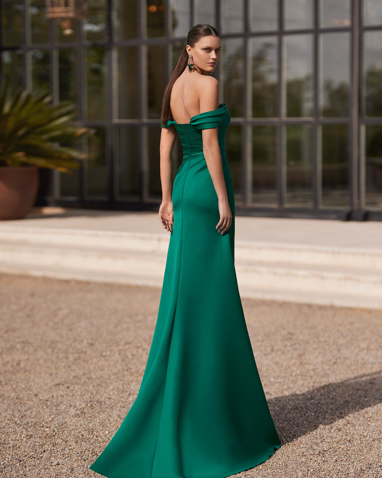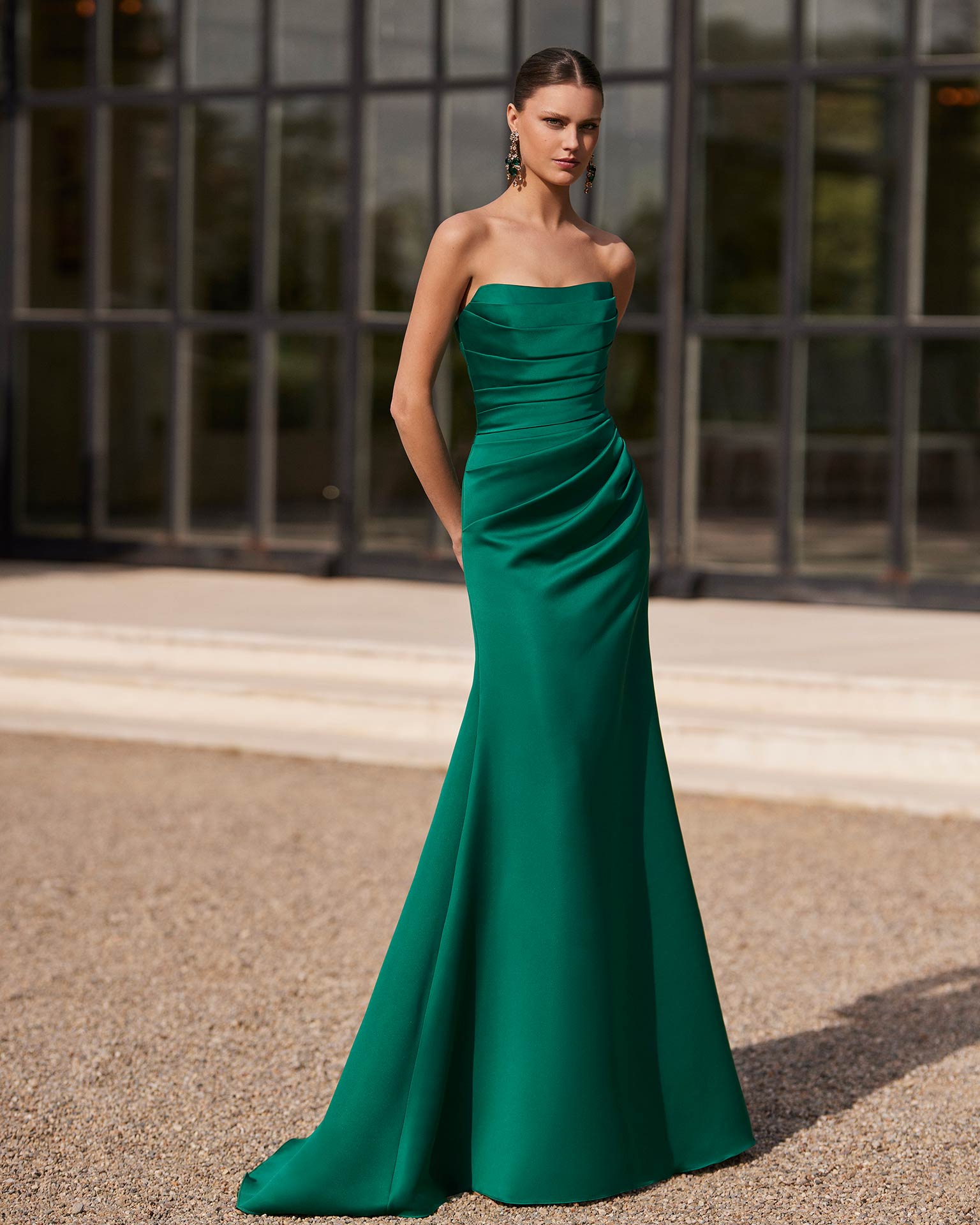 This long satin evening dress showcases a strapless neckline, open back, and sleeveless bodice. The elegant Marfil Barcelona look exudes sophistication and style for any special occasion. A must-have for those who want to make a statement.