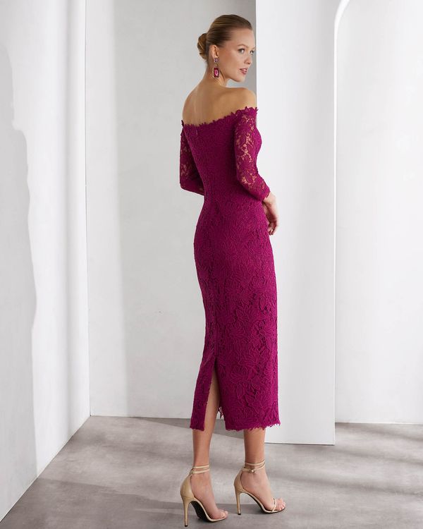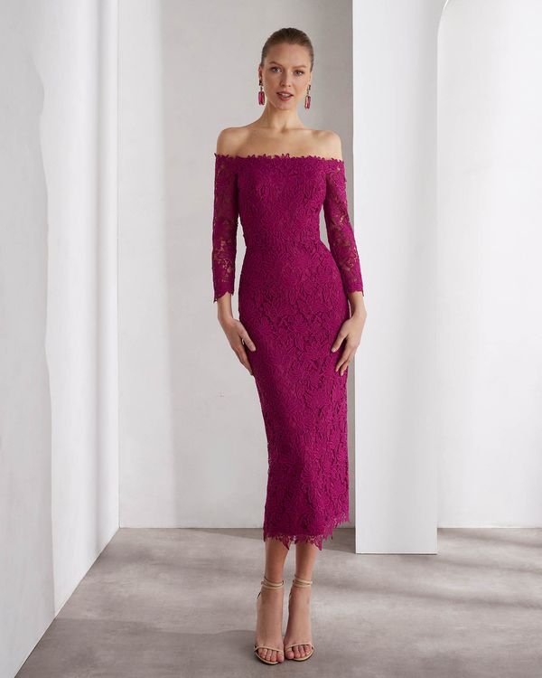 Unleash your elegant side with our short evening dress crafted in guipure lace. The strapless neckline and keyhole back add allure, while the three-quarter sleeves provide coverage. Be the center of attention in this Rosa Clará Cocktail look.