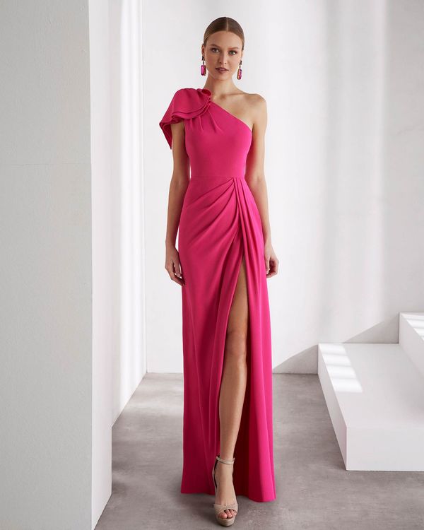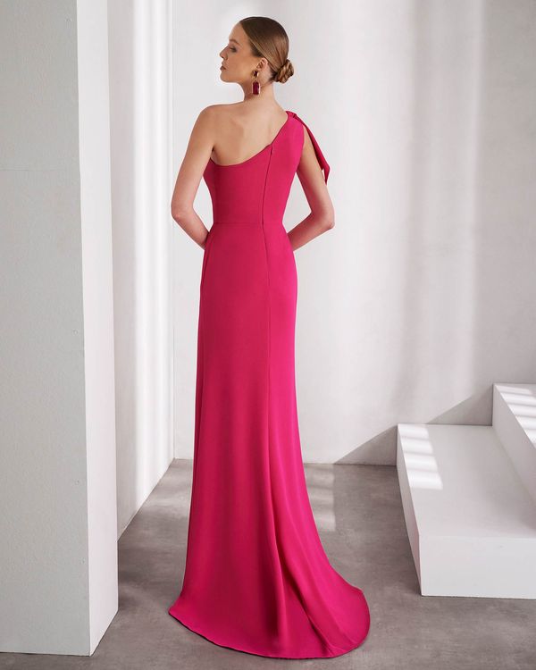 The 9TB4 is a stunning long evening dress, expertly crafted in luxurious crêpe fabric. Its elegant design features an asymmetric neckline and a strap adorned with a chic bow, creating a gorgeous Rosa Clará Cocktail look. Elevate your style with this sophisticated dress.
