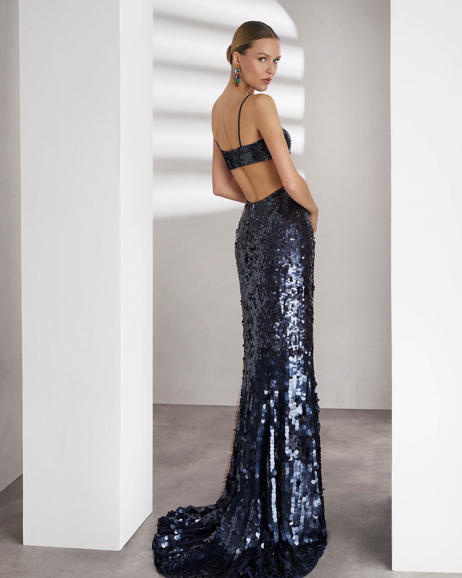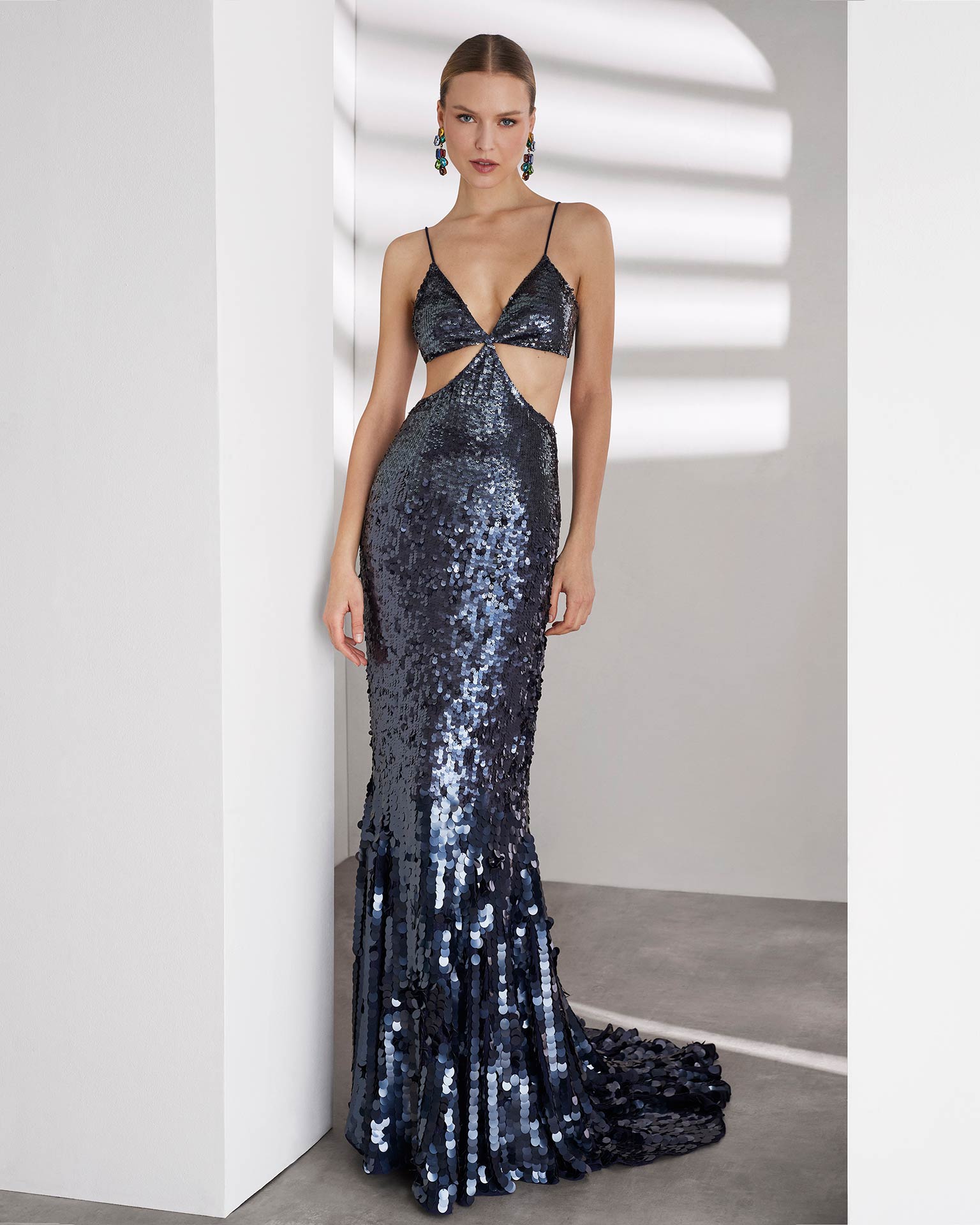 Elevate your evening look with our expertly hand-sewn sequin gown. A sleek V-neckline, keyhole back, and cut-out embellishment add sophisticated details to this Rosa Clará Cocktail dress. Shine with confidence in this stunning long evening gown.
