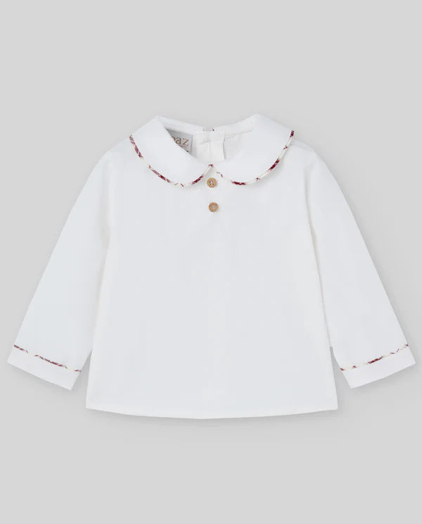 Cotton shirt in ACEBO collection fabric with visible trimming in contrasting tone. Mao collar and front buttons from Paz Rodriguez fw 25/26 collection.