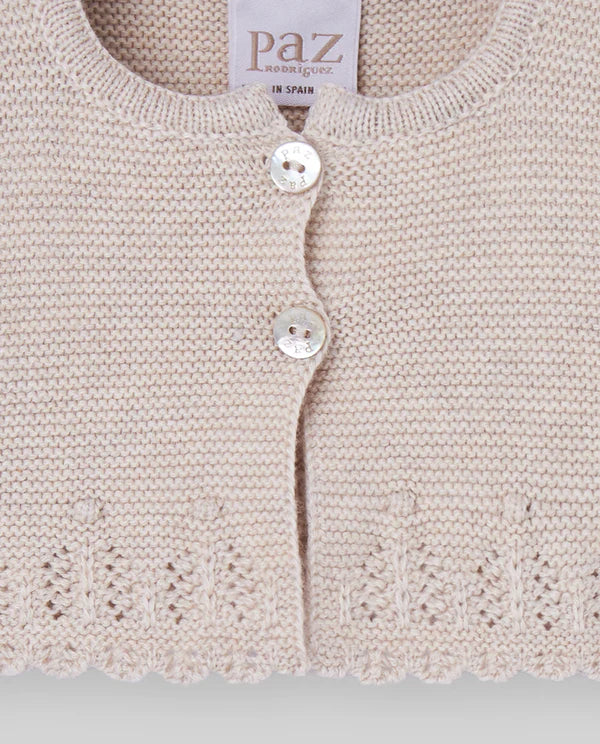 Short knitted jacket made from a soft cotton and cashmere blend in a garter stitch texture. Features decorative openwork along the hem and cuffs, finished with a subtle scalloped edge. It has a round neckline and front button fastening, perfect for pairing with dresses, rompers, or bloomers. Lightweight and versatile, it is suitable for any occasion from the first months up to age 6. By Paz Rodriguez