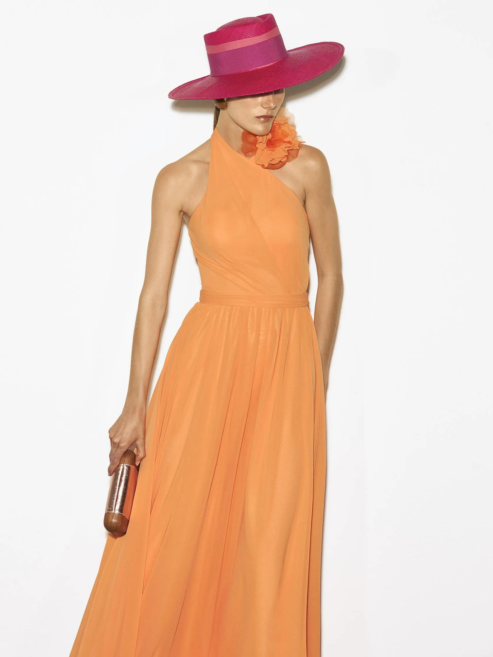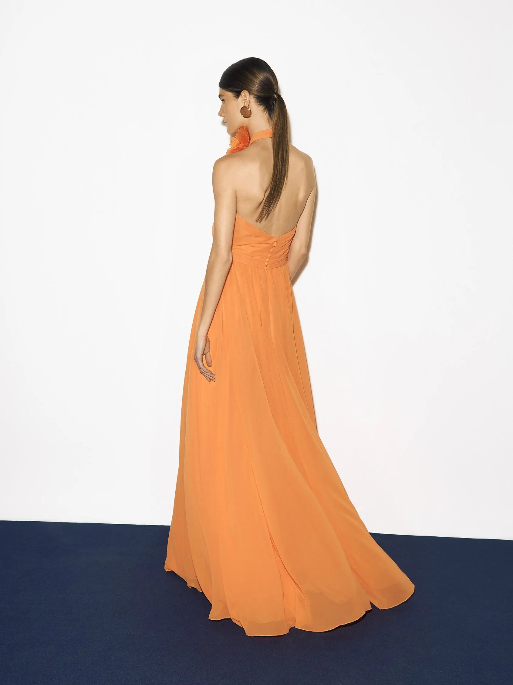 This Aleria The Party Edit X Pronovias dress features a flattering A-line silhouette and a flowy chiffon fabric, making it the perfect choice for any party. The halterneck style adds a touch of elegance to the overall design. Elevate your party look with this sophisticated and stylish dress.