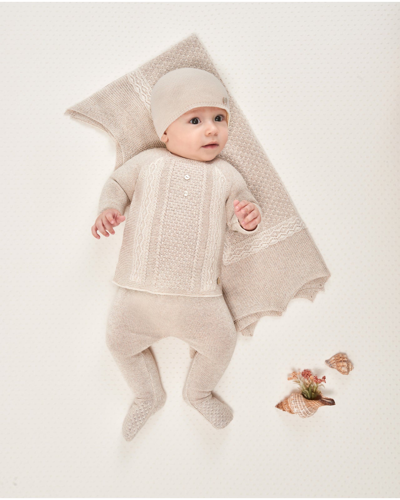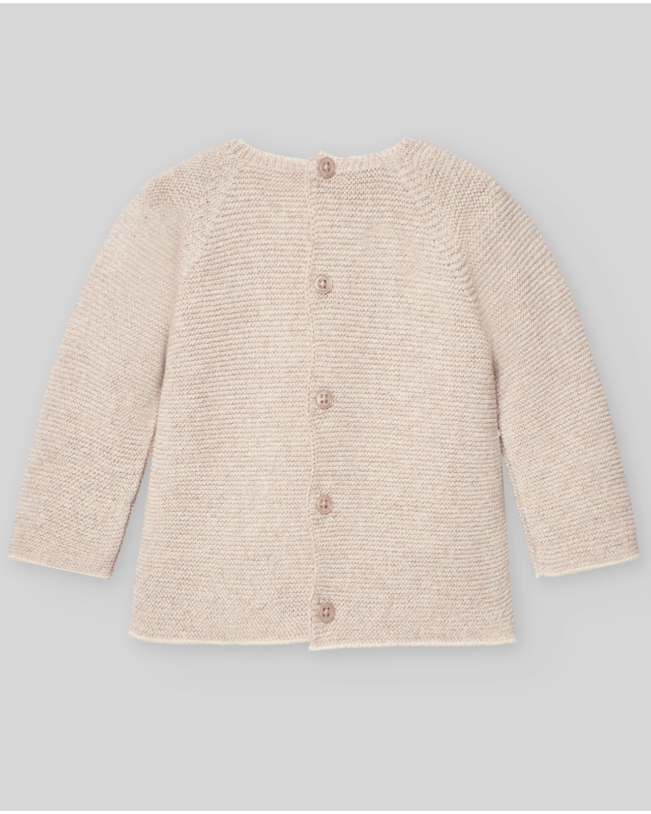 Sweater mottled knit. Detail of vertical lace on the front with two decorative mother-of-pearl buttons. Round neck and long sleeves. Back closure with tone-on-tone buttons.