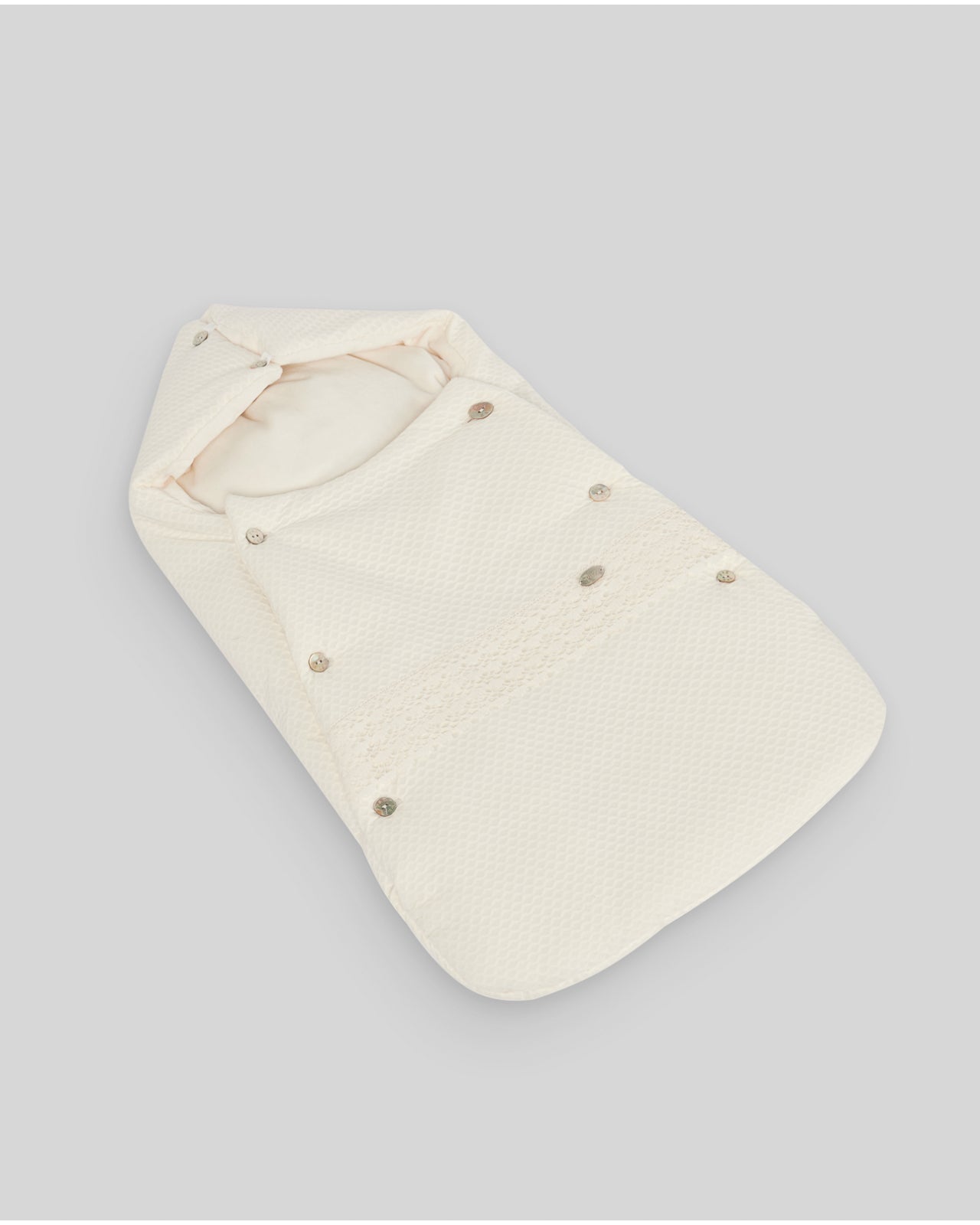 Introducing the "DOLINA" Baby Cocoon! Made with soft piqué fabric, lace trim decoration, and a cozy tundosado interior, it's perfect for snuggling your little one. Designed with rear eyelets, it's compatible with group 0+ baby carriers, making it the ultimate on-the-go accessory for carrying your baby.