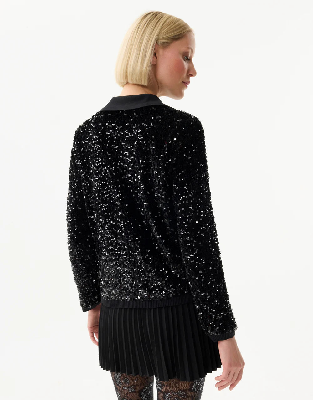 The black BELLA cardigan stands out for its luminous elegance thanks to its delicately embroidered sequins all over. Both sophisticated and festive, it adds a glamorous touch to all your outfits, whether worn with a pleated skirt, fitted pants, or even layered over a dress. Its shirt collar and button closure give it a chic and structured look, ideal for your evenings or special events. The soft and comfortable knit ensures pleasant wear throughout the day or night.