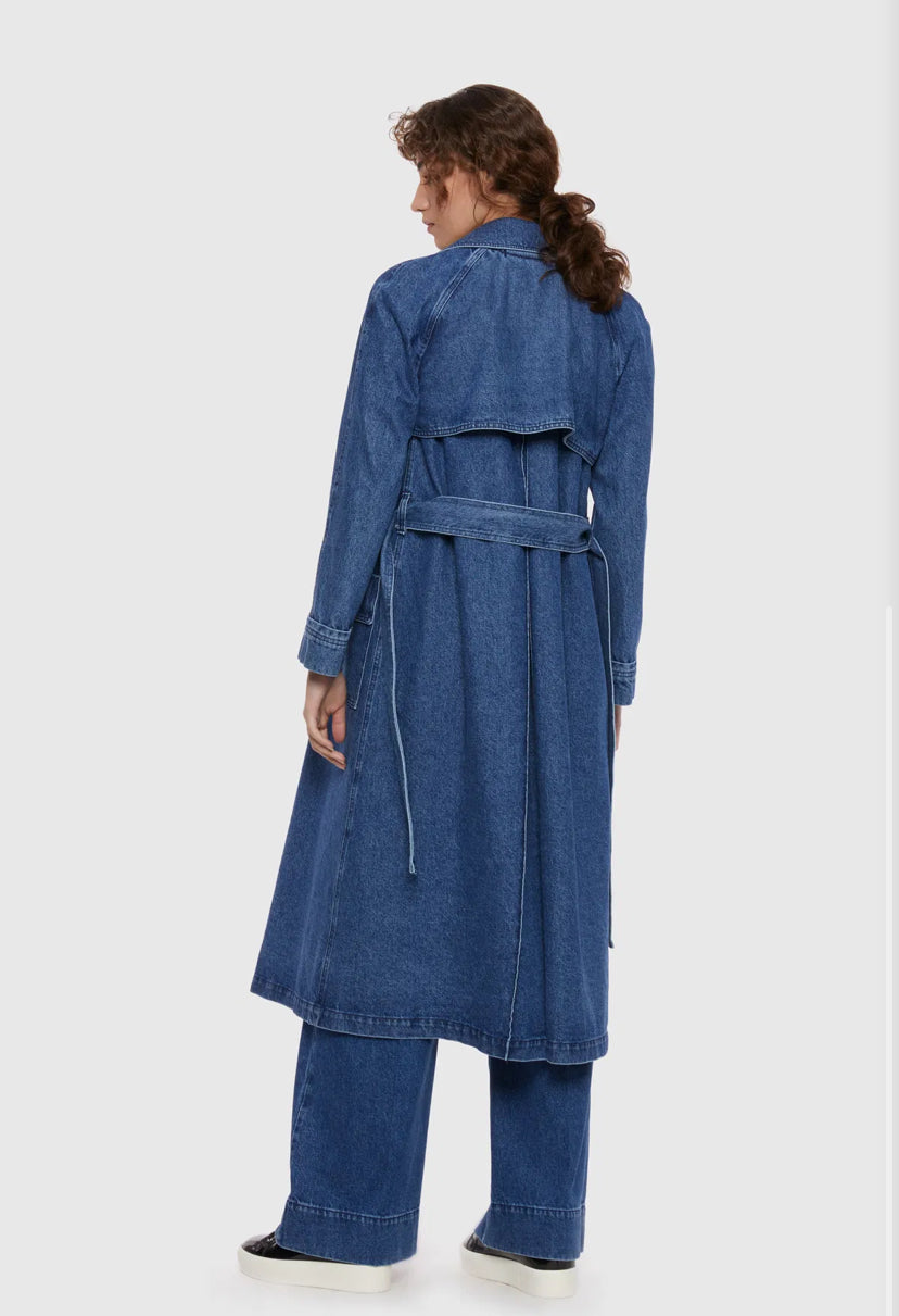 The belted denim blue trench coat is a chic and versatile outerwear piece that blends the timeless appeal of a trench coat with the casual cool of denim. This coat features a classic double-breasted design with wide lapels, buttoned front closures, and a matching denim belt that cinches at the waist for a flattering silhouette. The mid-length cut and structured shoulders give it a sleek, polished look, while the denim fabric adds a laid-back, modern twist. Perfect for layering over both casual and semi-formal outfits, this trench coat offers a fresh, stylish take on a wardrobe staple.