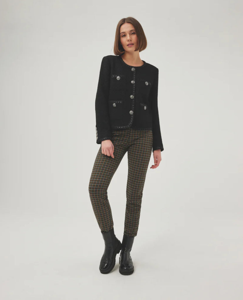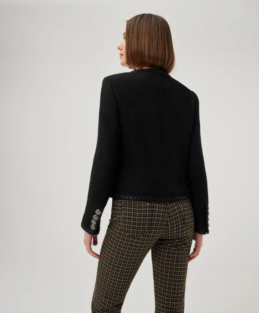 The Lola Jacket is a sophisticated and timeless addition to any wardrobe. Collarless and made from black tweed or boucle, this jacket features a structured silhouette and elegant silver-tone metallic buttons. With four functional front pockets adorned with matching buttons and subtle detailing, this jacket exudes a refined, vintage-inspired style. Perfect for professional or upscale casual wear.