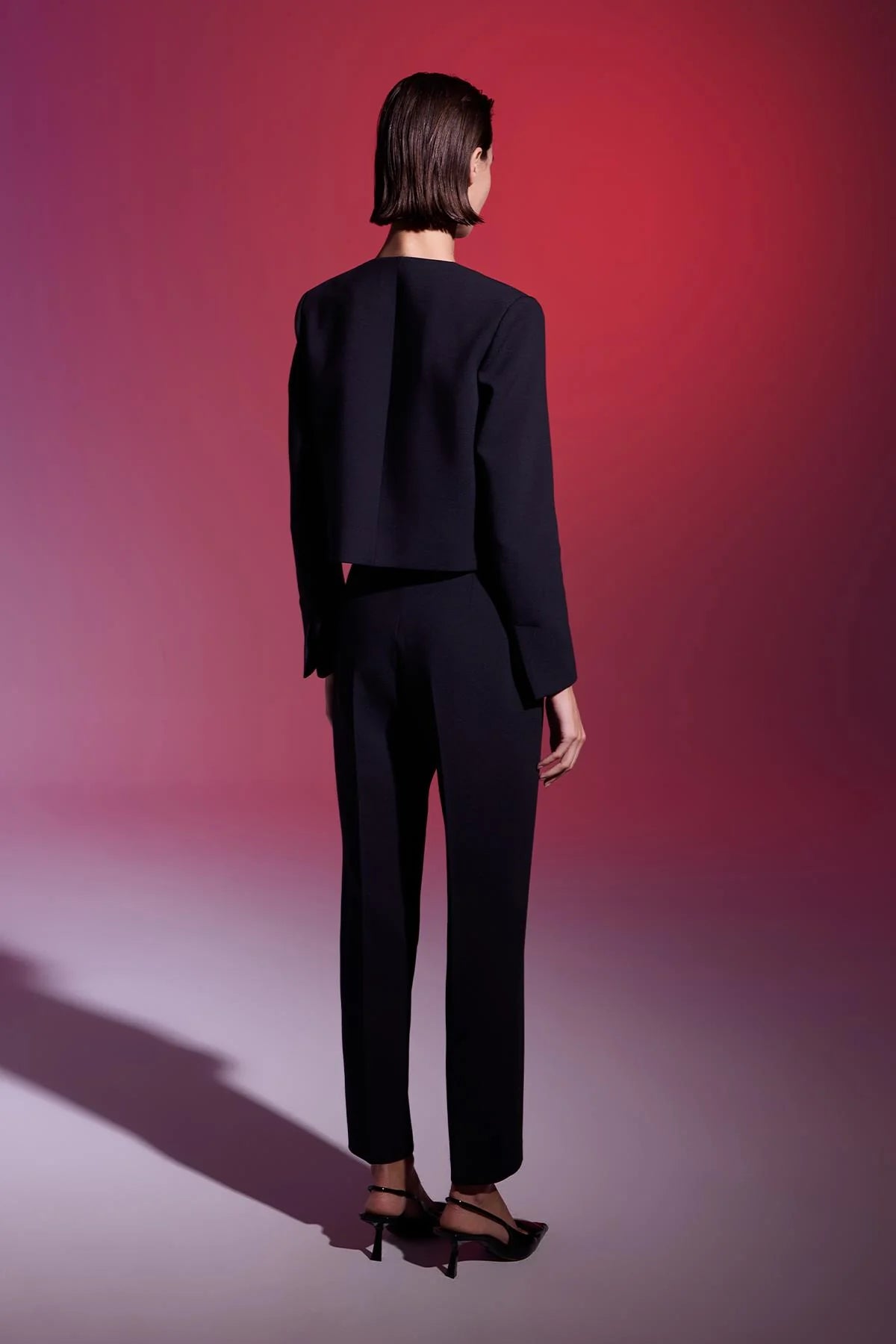 Elevate your wardrobe with this striking Jacket. It features a meticulously crafted black jacket adorned with delicate stone embroidery, showcasing both double-breasted and single-breasted styling options for versatile wear. Pair it with tailored trousers that complement the jacket's refined aesthetic, this collection piece exudes timeless elegance and contemporary sophistication. Perfect for elevated occasions or refined everyday styling, the intricate embellishments and impeccable tailoring ensure a polished, statement-making look.