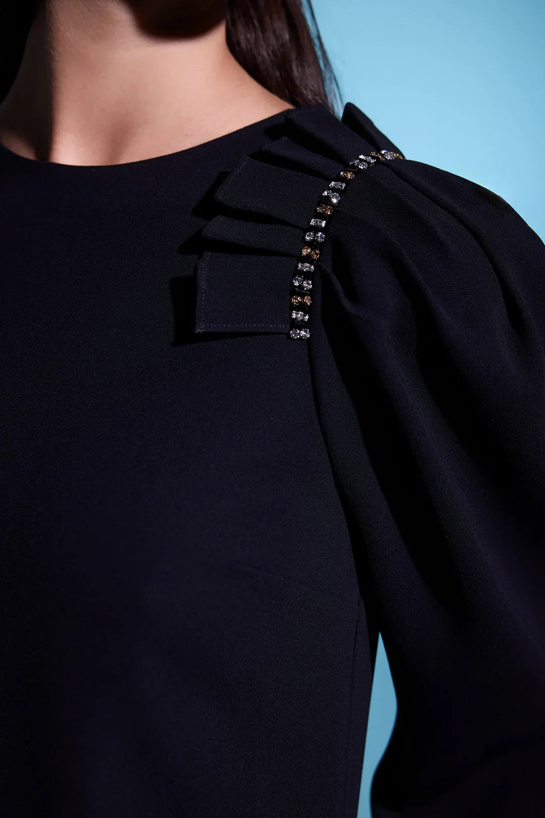 " Round neck, shoulder embroidered stones and pleat detail, long sleeves, hidden zipper closure at the back, relaxed fit, crepe mini black dress.