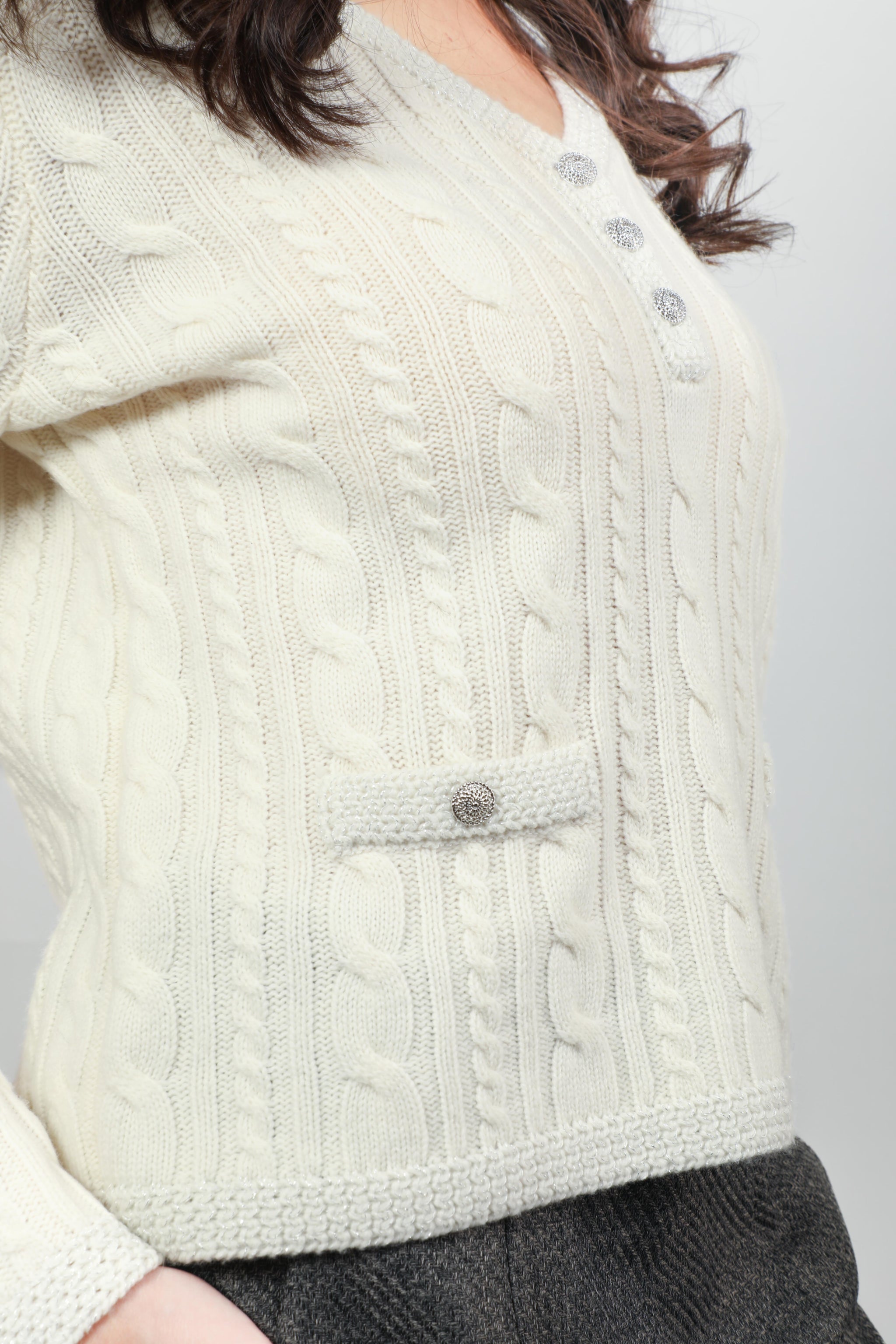 A cozy, cream-colored cable-knit sweater featuring a flattering V-neckline with three glimmering buttons for a touch of refinement. The front is detailed with two faux pocket flaps, each adorned by matching embellished buttons, adding a subtle yet sophisticated accent. The textured knit pattern and soft, ribbed edges ensure both comfort and a polished silhouette, making it a versatile piece for your everyday or dressed-up ensembles.