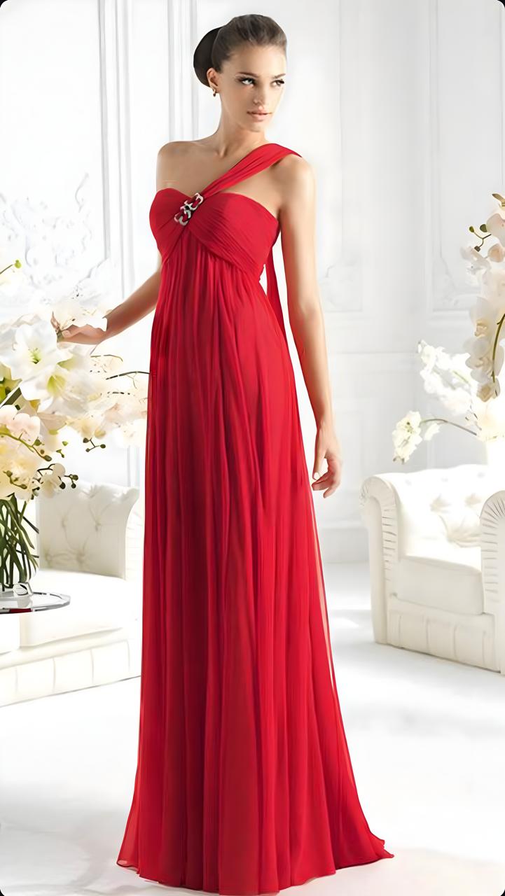 This stunning evening gown by Pronovias is crafted from luxurious chiffon fabric , offering a light and flowing feel . The gown features a sophisticated one-shoulder design , creating an elegant and streamlined silhouette . The soft drape of the chiffon enhances the gown’s graceful movement , making it ideal for formal occasions . With its refined detailing and timeless style , this gown ensures a look that is both modern and effortlessly chic .