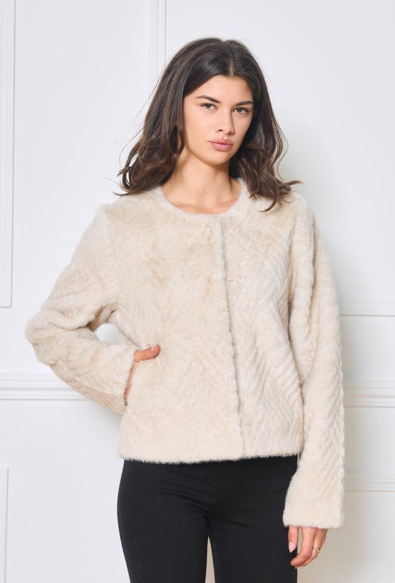 This elegant faux fur jacket features a soft chevron pattern, giving it a unique textured look. The design is minimalistic with a round neckline and a hidden front closure, offering a clean and sophisticated silhouette. The jacket’s slightly cropped length and cozy feel make it a versatile piece for both casual and formal wear, perfect for adding a touch of luxury to any outfit during the colder months. Its neutral tone enhances its versatility, effortlessly complementing a variety of styles and occasions.