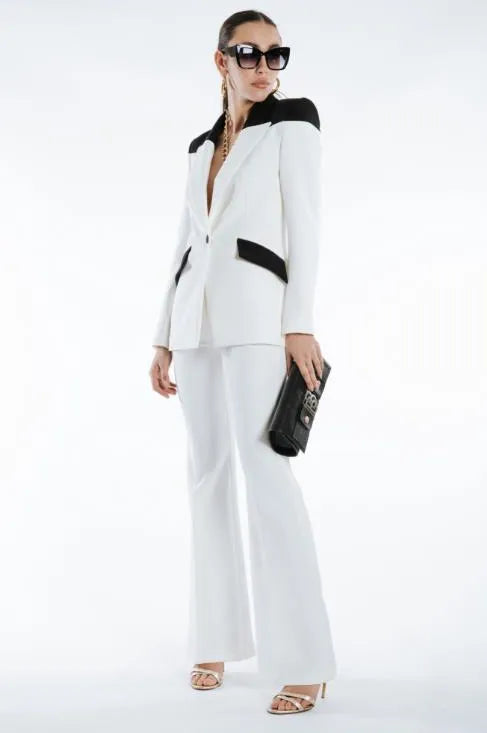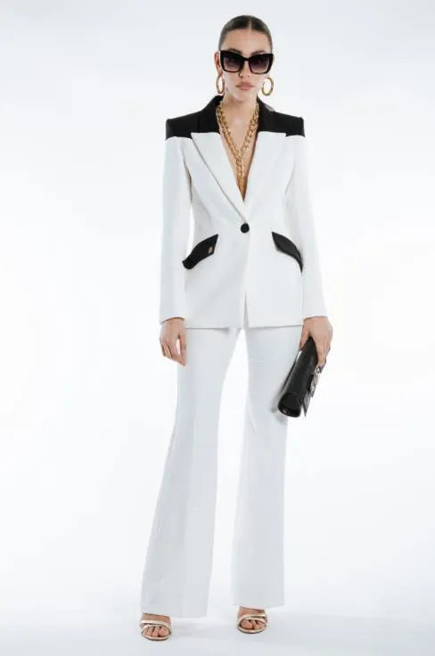 Command attention with this sleek Contrast Power Suit, designed to exude confidence and modern elegance. Featuring a bold color-block design, the tailored blazer and matching trousers create a striking, structured silhouette that flatters every figure. Perfect for professional settings, evening events, or stylish gatherings, this suit combines sharp tailoring with contemporary flair, making it a must-have for the empowered, fashion-forward woman.