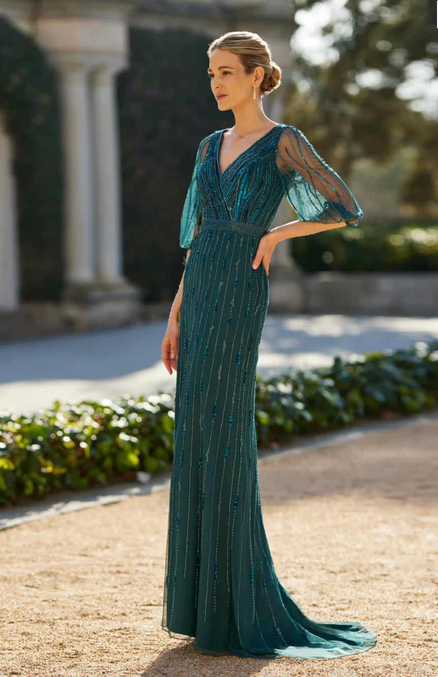 Showcase refined elegance with the Couture Club evening dress , featuring intricate beadwork that adds a touch of sophistication . The dress highlights a flattering V-neckline , a sleek closed back , and dramatic puffed sleeves , combining classic elegance with contemporary design . Ideal for any formal event , it ensures a striking and graceful appearance .