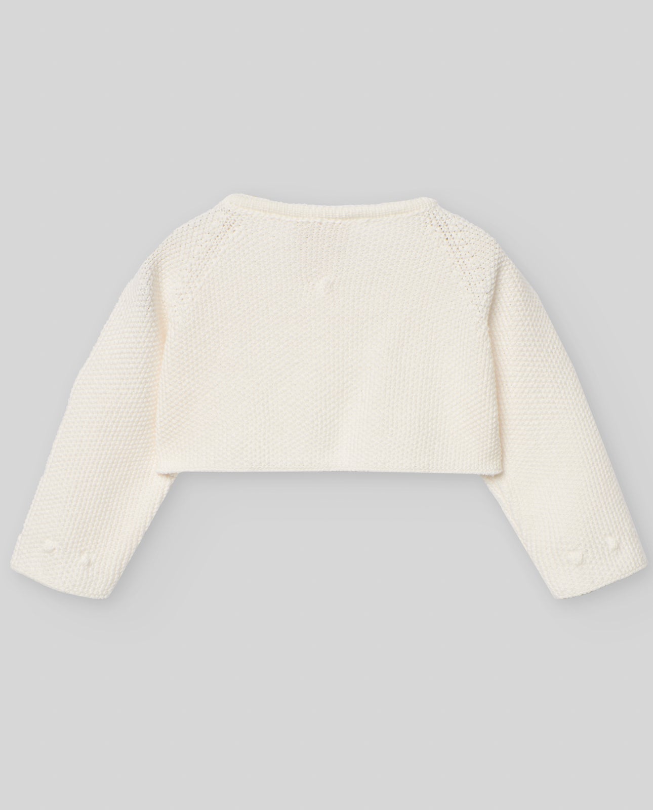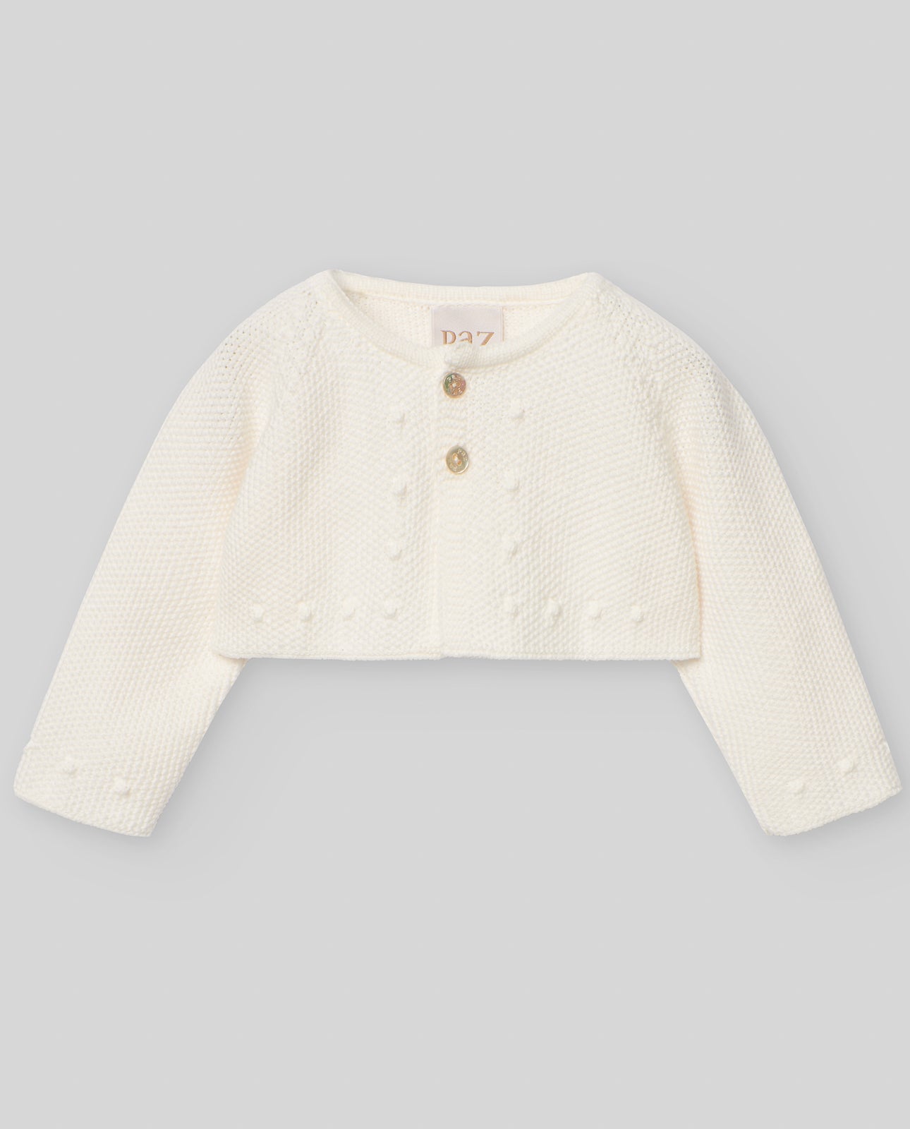 This soft cream cardigan blends classic charm with modern texture, featuring delicate knit details and playful bobble accents. Designed with long sleeves and two front buttons, it’s a cozy and stylish layer perfect for any little outfit. Whether paired with dresses or casual sets, this cardigan adds warmth and timeless elegance to your baby's wardrobe.