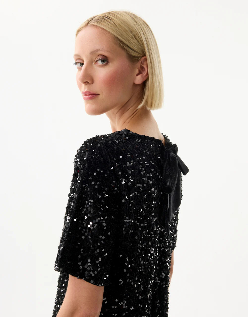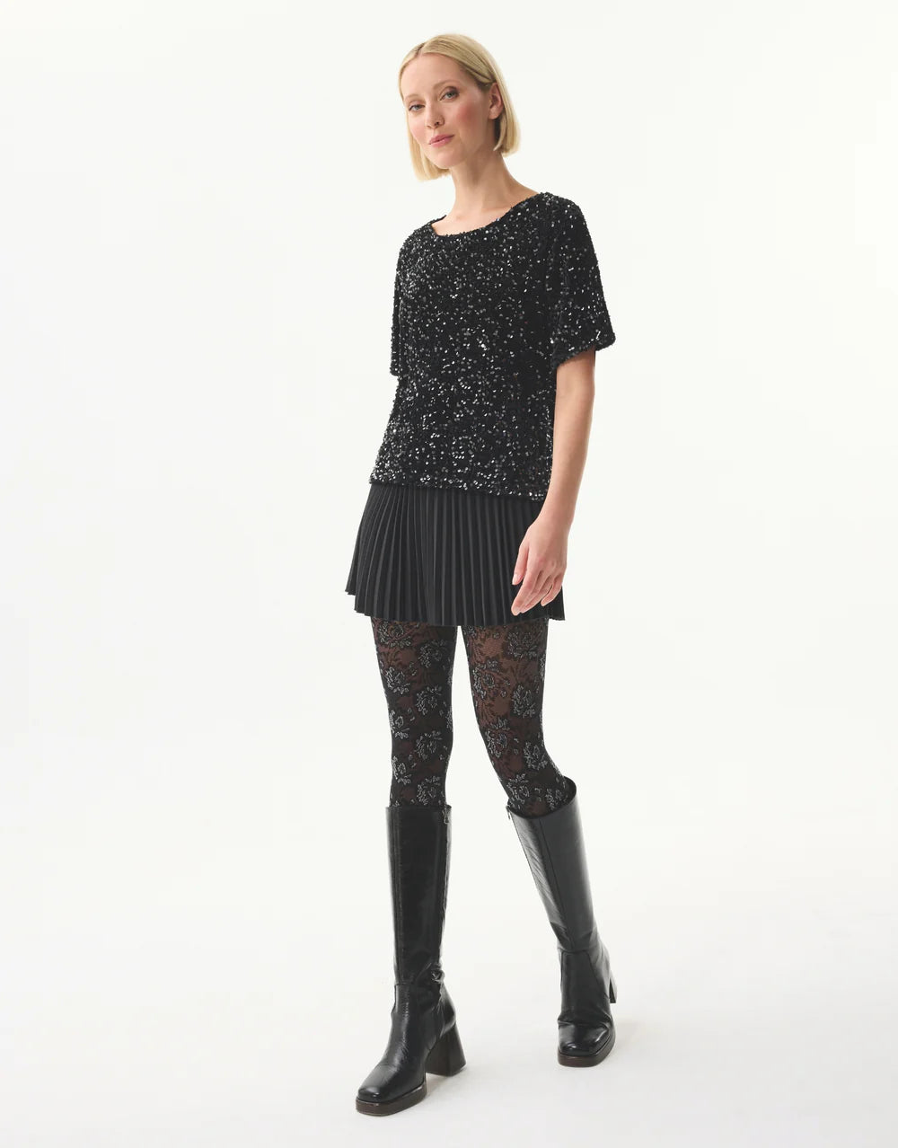The black CYRIELLE t-shirt is enhanced by a shower of sequins that catch the light with every movement. With its straight cut and short sleeves, it combines comfort and refinement for a style that is both chic and easy to wear. Ideal for your evenings or festive events, it pairs equally well with a pleated skirt, tailored trousers, or jeans for a more casual yet always sophisticated look. Its soft knit ensures a smooth and elegant drape, perfect for shining in any circumstance.