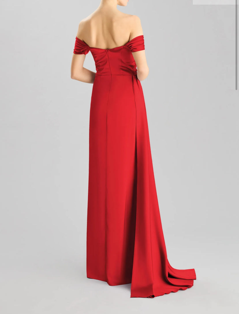 Turn heads with Pronovias' Scarlet Allure gown, an exquisite red satin evening dress that exudes timeless glamour. The off-shoulder design elegantly frames the neckline, while the luxurious satin fabric flows beautifully, creating a stunning silhouette. Perfect for making a bold statement at any formal event, this gown combines classic style with a captivating modern edge.