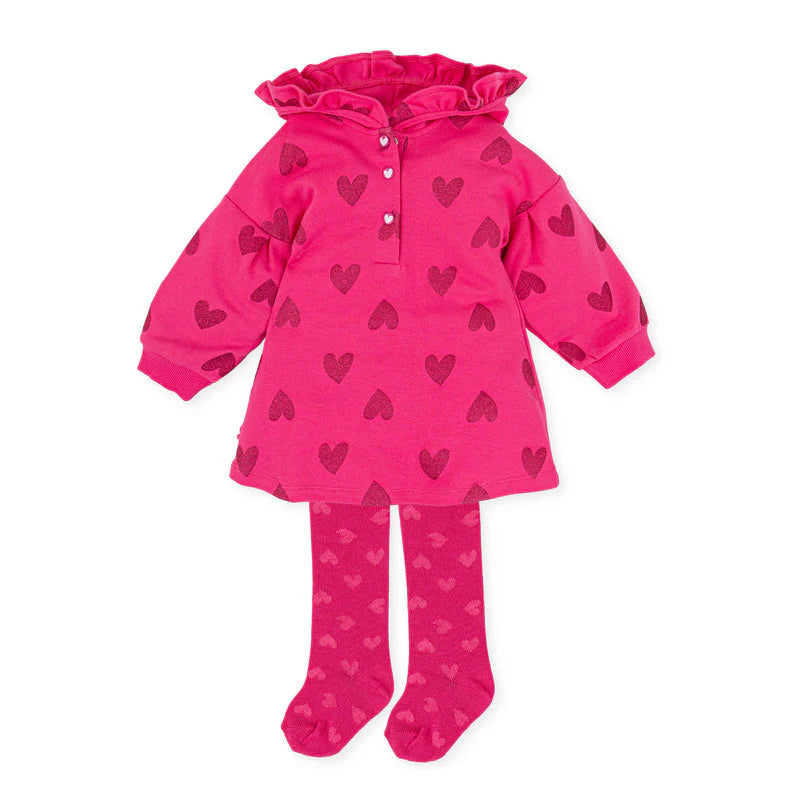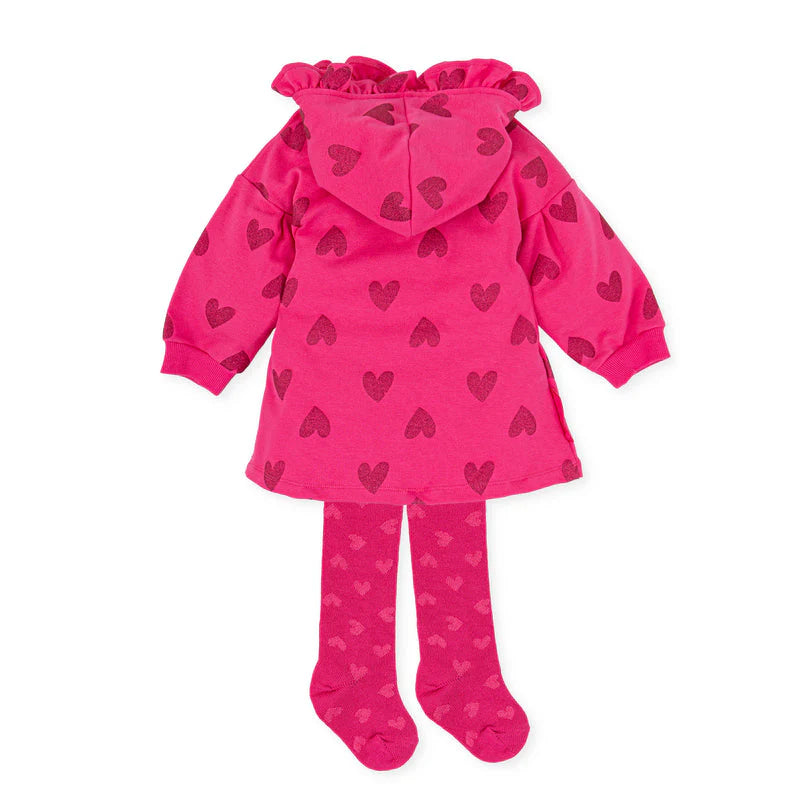Add some magical sparkle to your little girl's wardrobe with our fuchsia Roma knit dress! Featuring a glittery heart print, ruffled hood, and convenient snap buttons, this dress is both stylish and functional. Complete the look with the included fuchsia tights. Make her feel like a true princess!