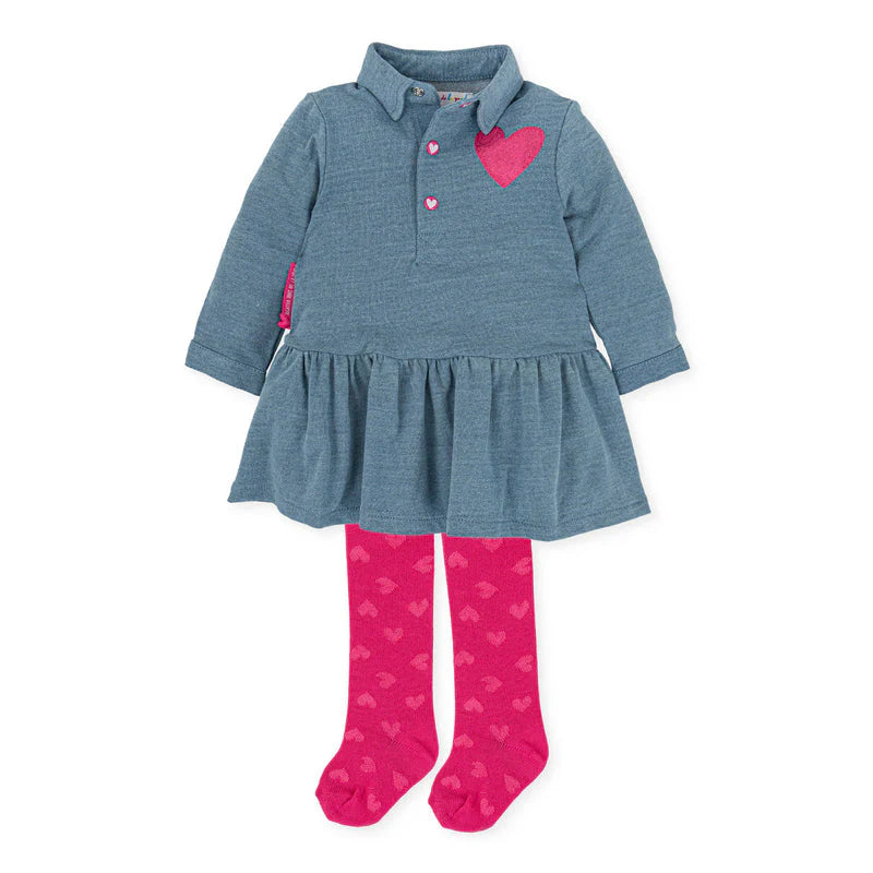 Introducing the Dress with Pen Panty! This denim plush dress features a front opening with snap buttons for easy dressing, while the glitter printed heart decoration on the front and heart detail on the back add a touch of whimsy. Paired with the fuchsia tights, this outfit is both stylish and comfortable for your little one. Get ready to fall in love with this adorable dress!