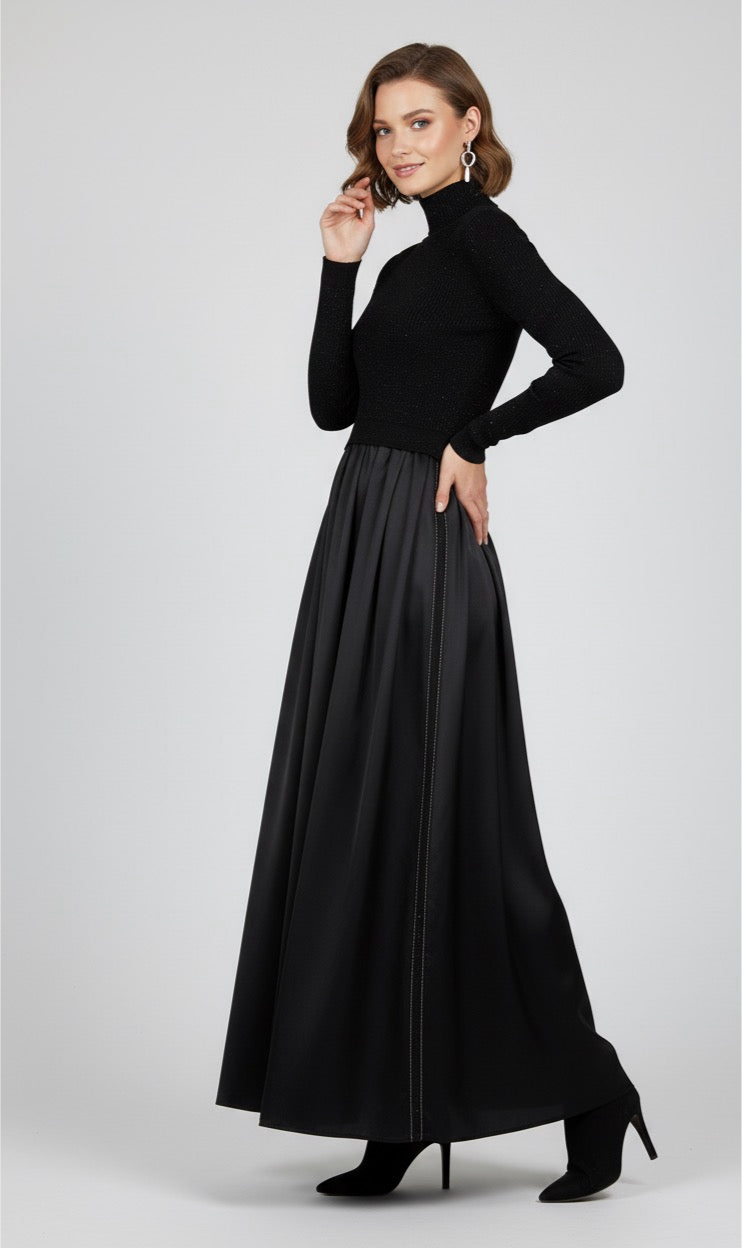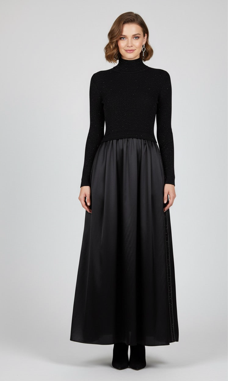 Embrace elegance with this exquisite dress combining the softness of Merino wool, the subtle shimmer of sequins, and the smooth sheen of stretch satin silk. From the Art Purotatto FW 25/26 collection, it blends luxurious fabrics with refined craftsmanship to create a standout piece that exudes sophistication and comfort for any occasion.