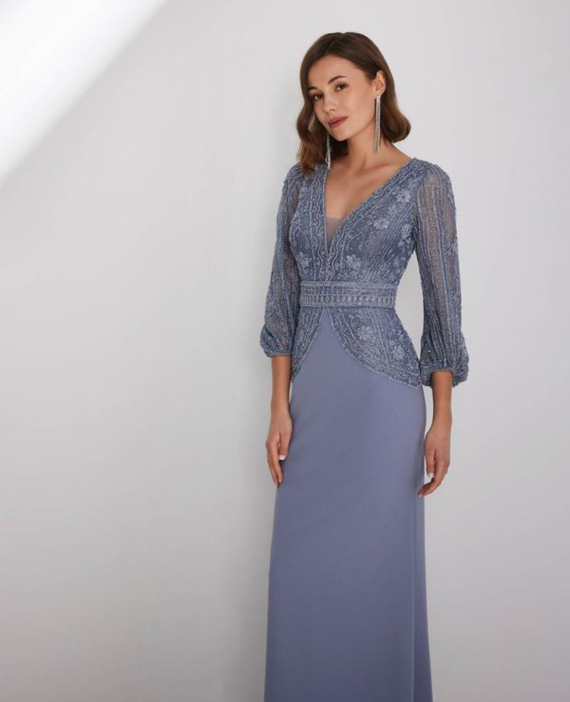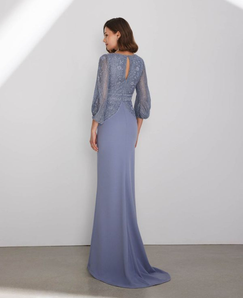 This stunning evening gown by Rosa Clará exudes timeless elegance, crafted from luxurious crepe fabric that drapes beautifully. The gown features exquisite hand-beaded detailing that extends from the sleeves down to the waist, adding a touch of intricate artistry and sparkle. The clean lines of the dress are complemented by its sophisticated silhouette, making it a perfect choice for any formal occasion where refined style is key.