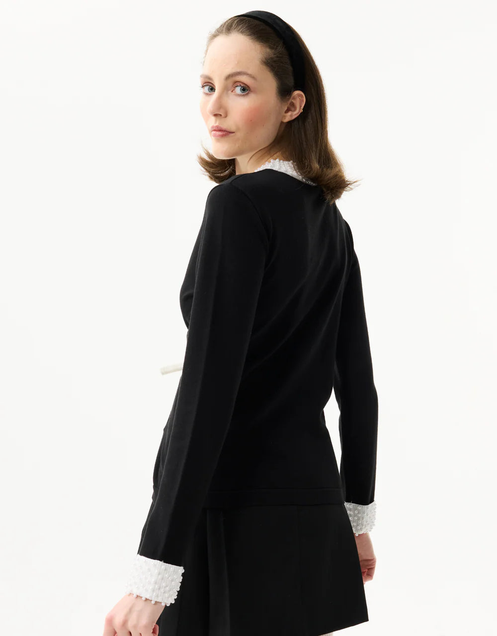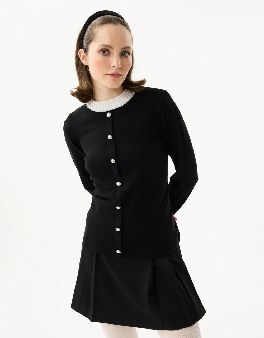 This black cardigan with a contrasting collar is a must-have fashion piece, easy to pair with a skirt, pants, or jeans for a sophisticated everyday style.