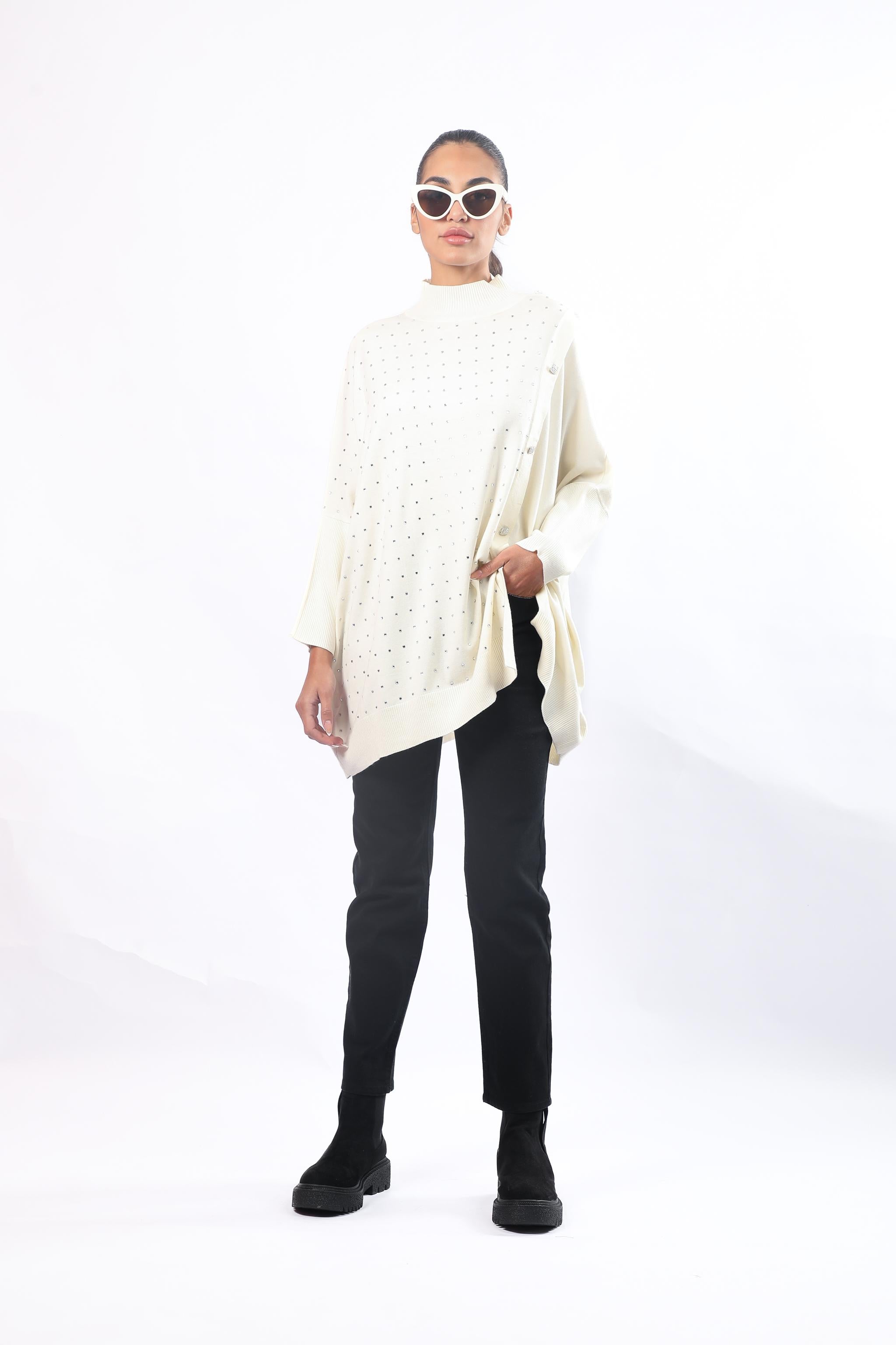 Make a statement in this effortlessly chic black tunic sweater, distinguished by a soft mock-neck and dazzling beadwork across the front. The relaxed, loose-fit silhouette drapes beautifully, while decorative side accents add an eye-catching twist. Perfect for pairing with slim-fit pants or leggings, this piece offers both comfort and flair for day-to-night styling.