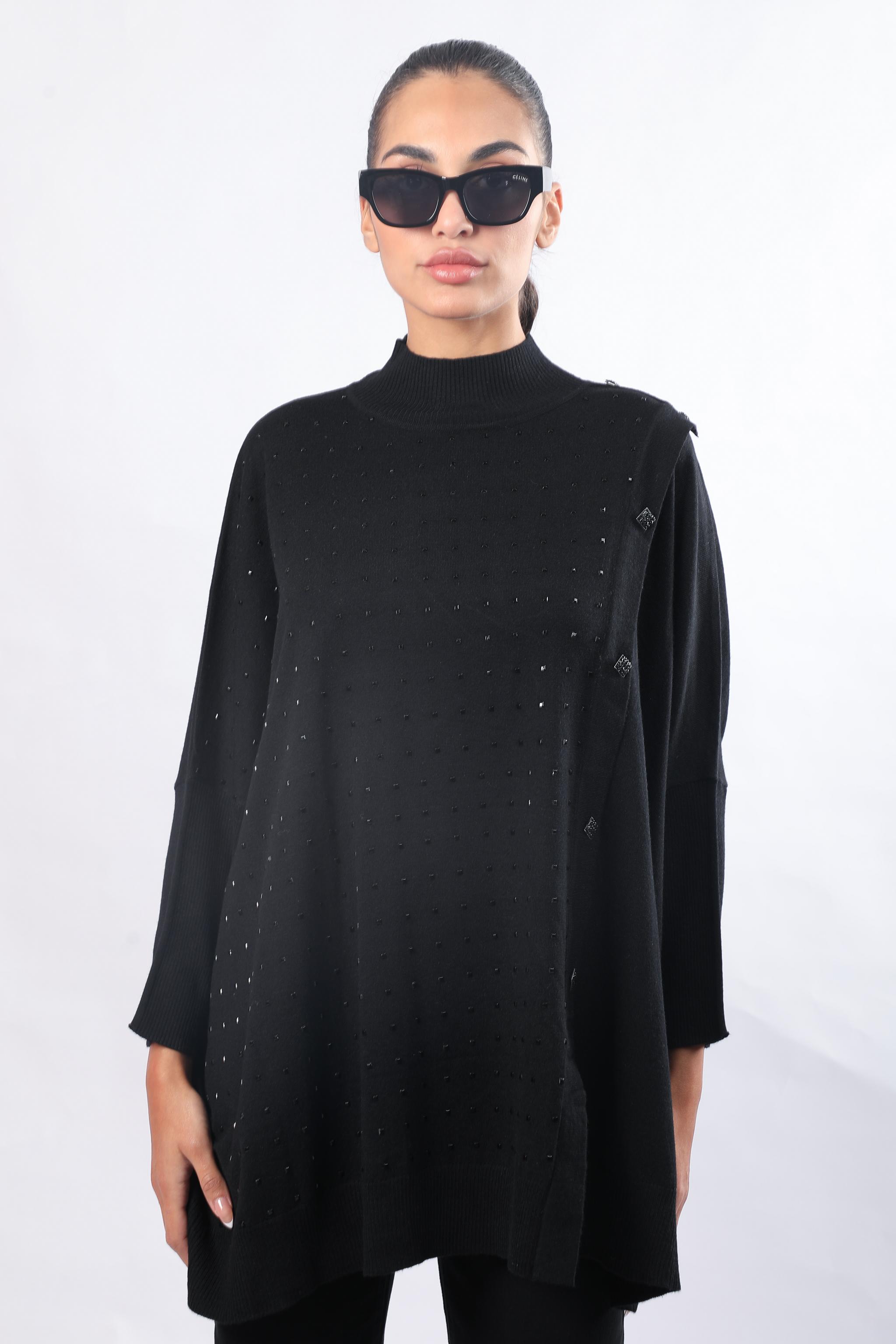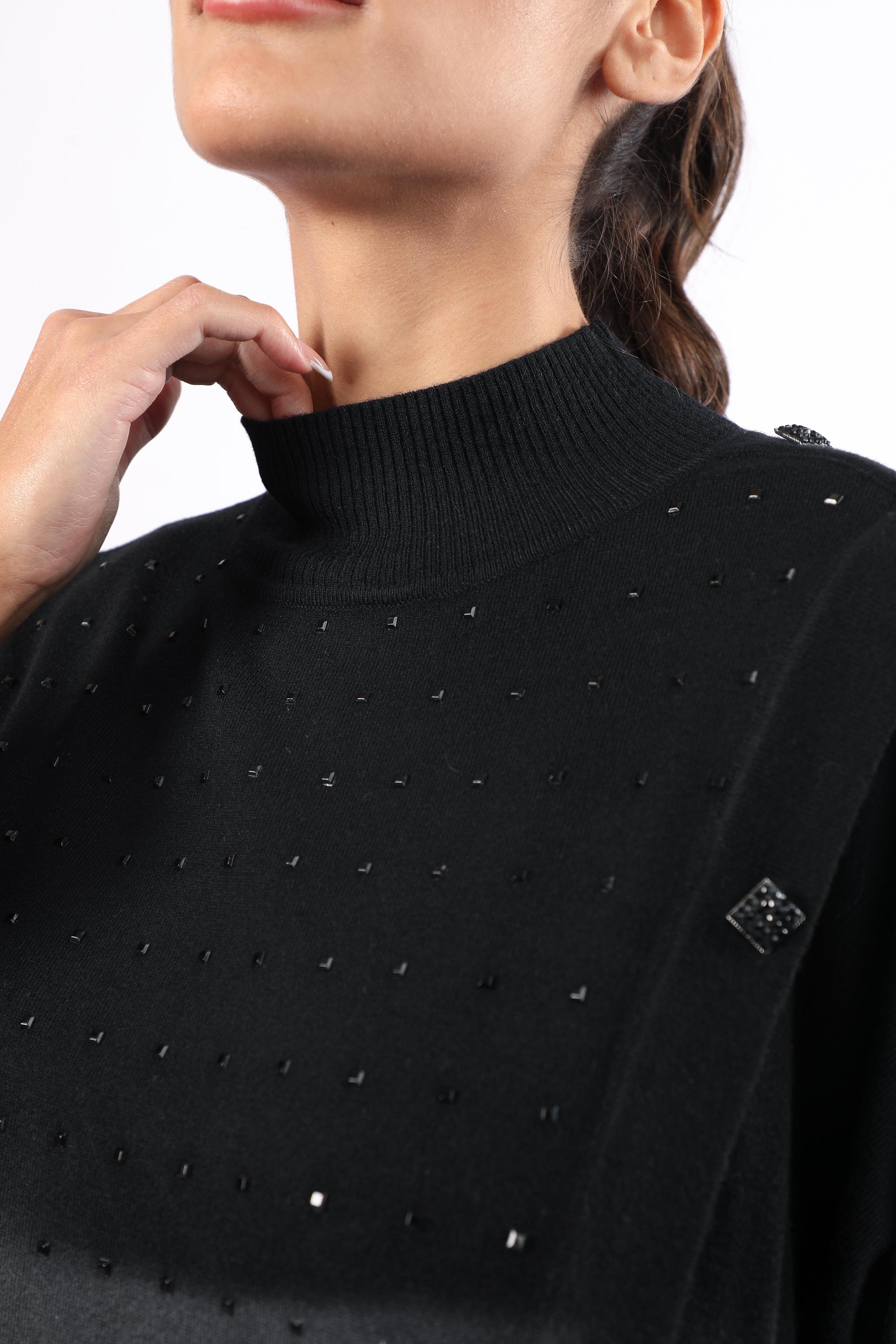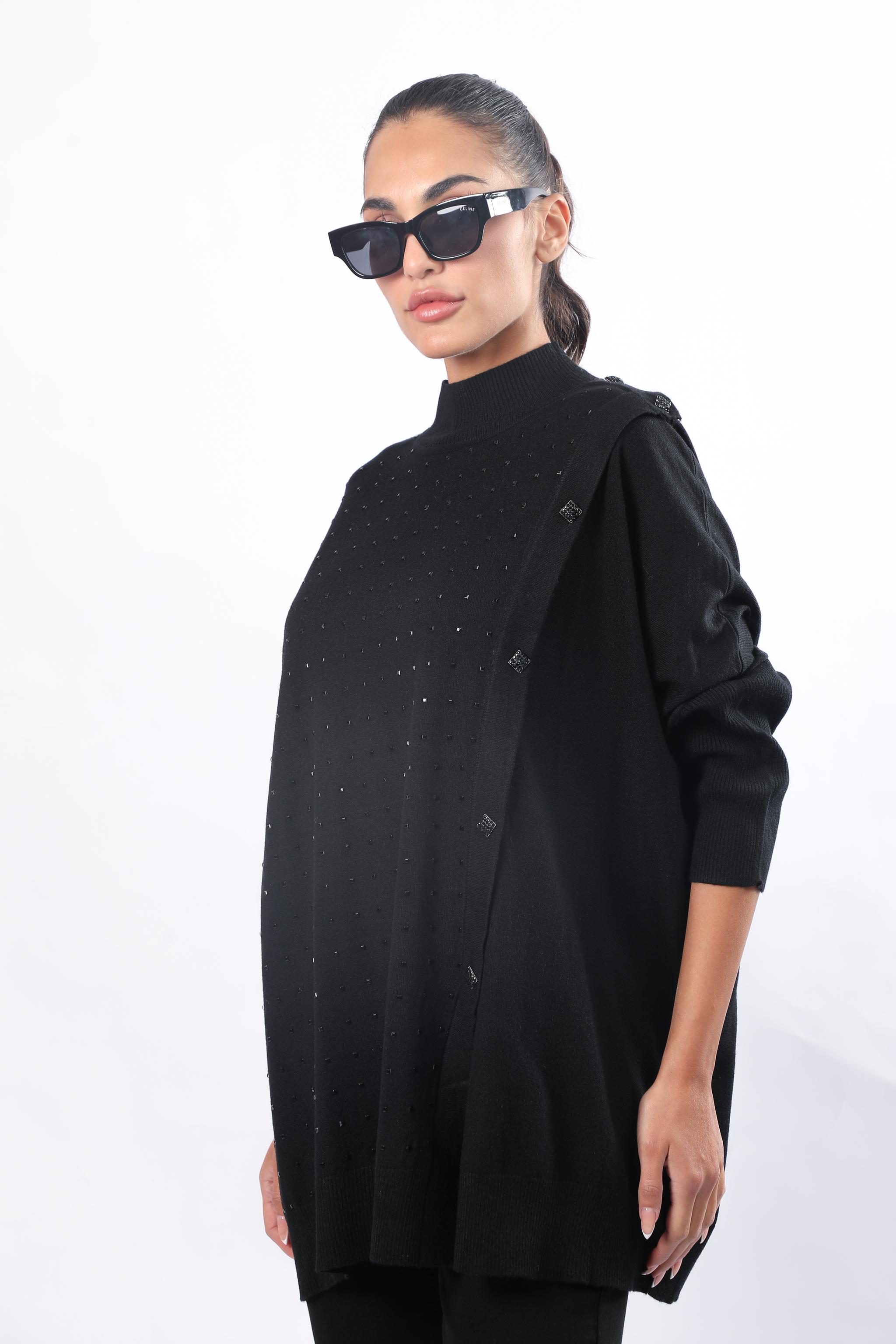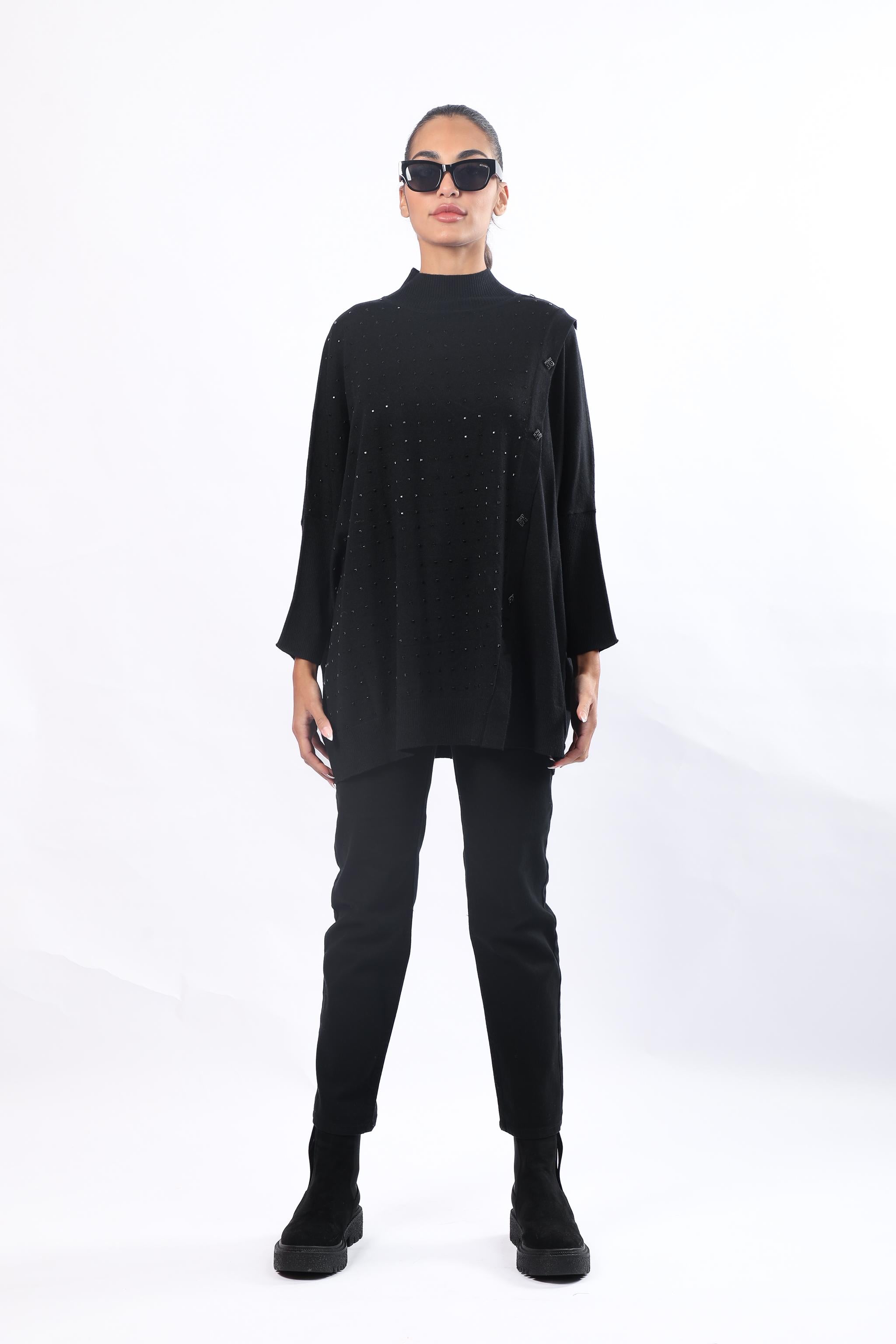 Make a statement in this effortlessly chic black tunic sweater, distinguished by a soft mock-neck and dazzling beadwork across the front. The relaxed, loose-fit silhouette drapes beautifully, while decorative side accents add an eye-catching twist. Perfect for pairing with slim-fit pants or leggings, this piece offers both comfort and flair for day-to-night styling.