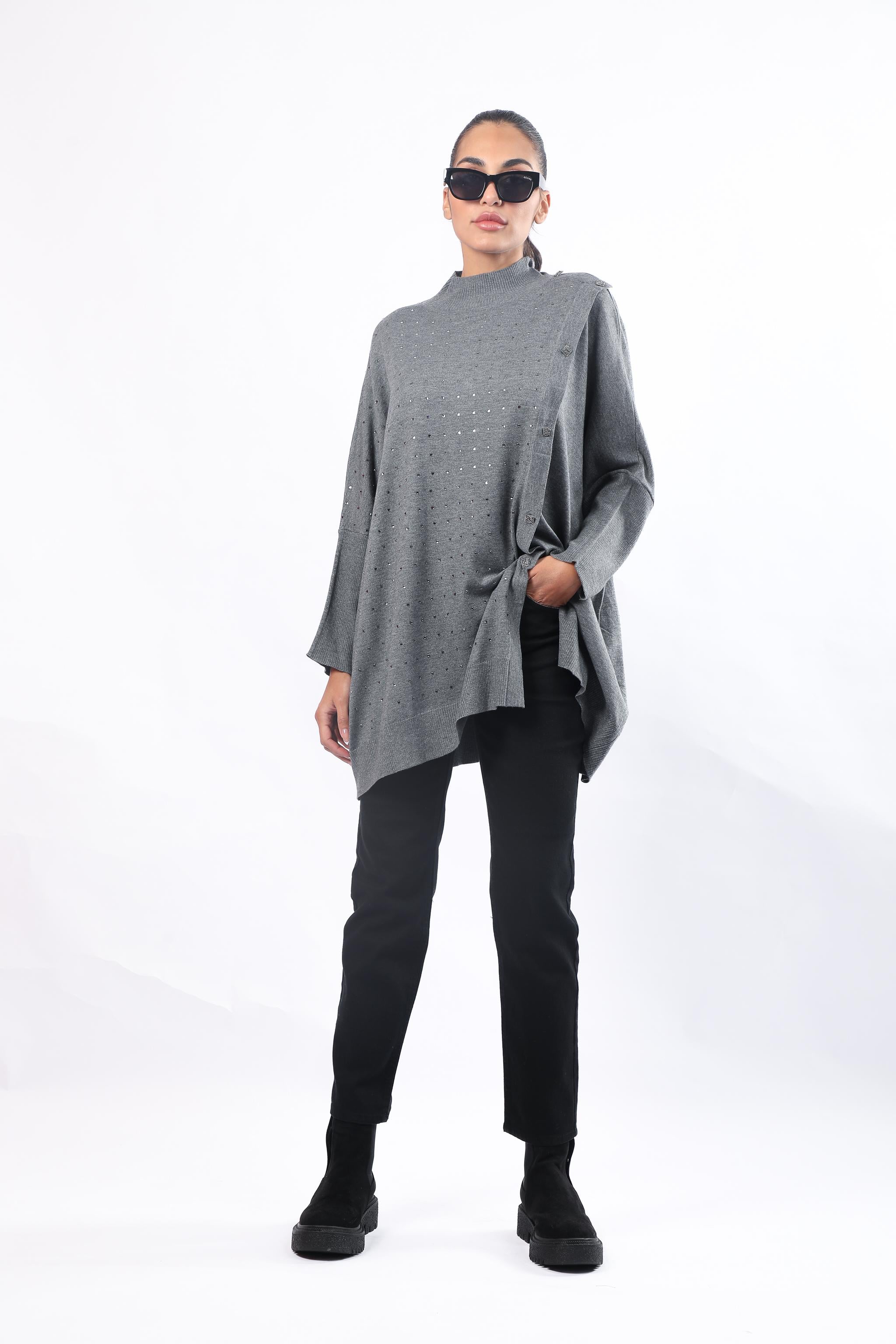 Make a statement in this effortlessly chic tunic sweater, distinguished by a soft mock-neck and dazzling beadwork across the front. The relaxed, loose-fit silhouette drapes beautifully, while decorative side accents add an eye-catching twist. Perfect for pairing with slim-fit pants or leggings, this piece offers both comfort and flair for day-to-night styling.