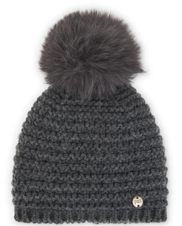 A baby and girl's hat with a fur pom pom and a structured knit. It combines warmth and style with a refined touch, perfect for the ESENCIAL collection by Paz Rodriguez.