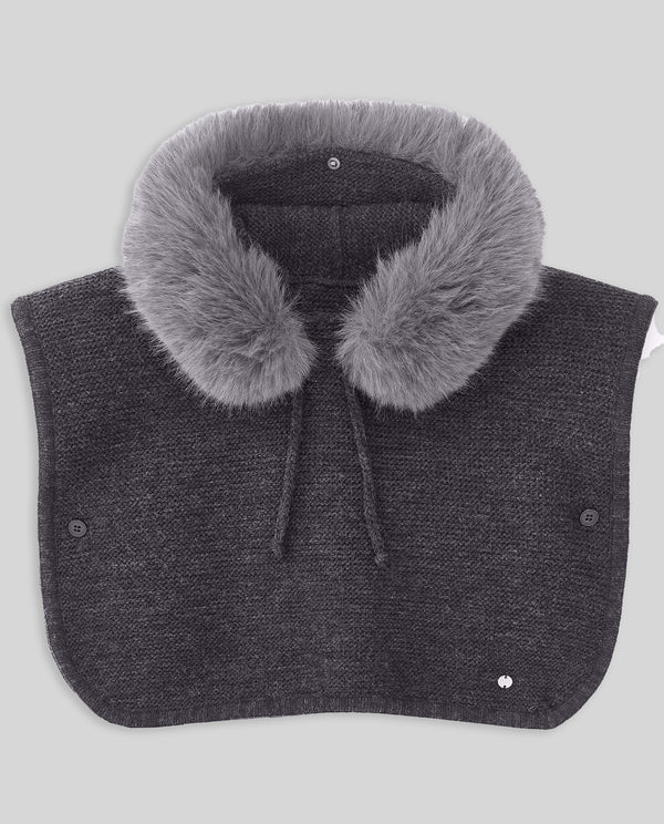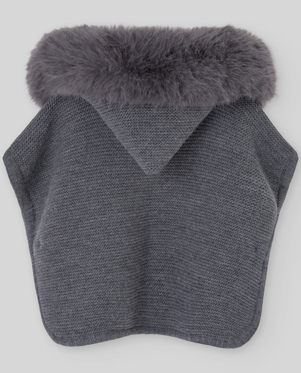 Girl’s hooded poncho featuring a removable faux fur collar with button fastening. The enveloping shape provides warmth and freedom of movement, ideal for winter layering with extra charm.