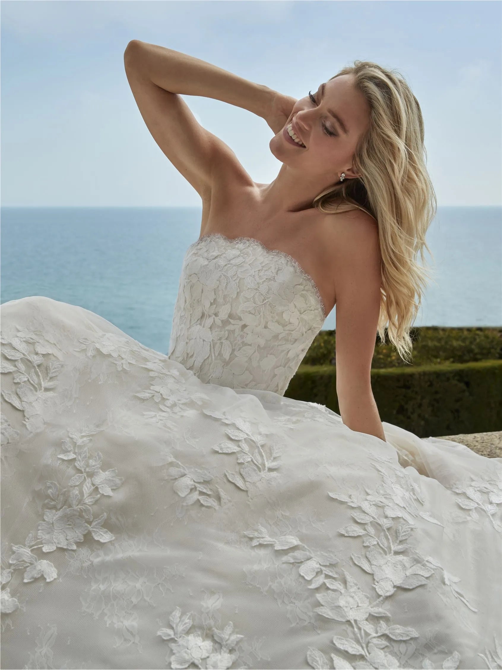 This princess-cut dress with a strapless neckline transforms thanks to a detachable top that allows for styling versatility. Floral lace and chantilly add romance and flexibility, creating a classic silhouette.