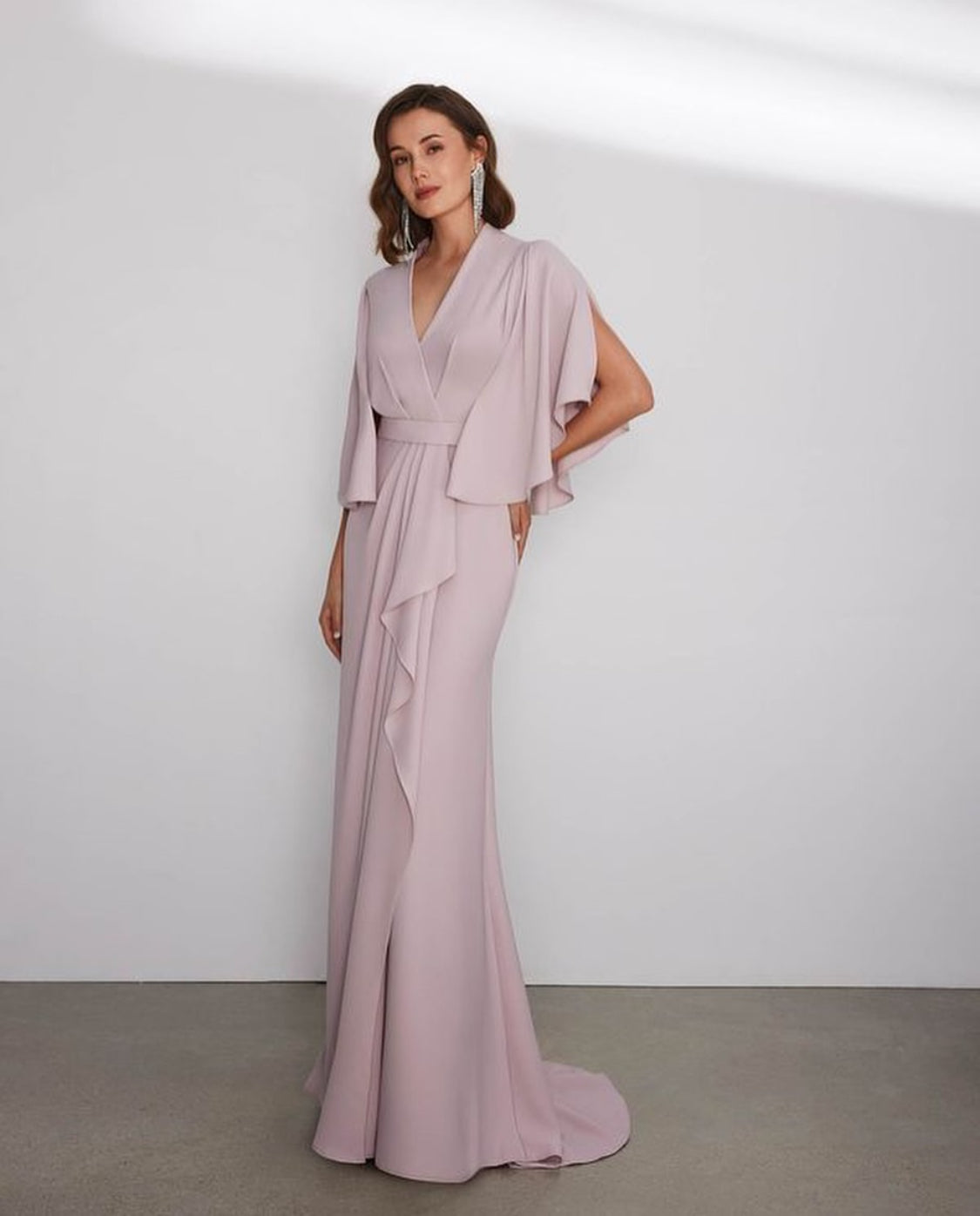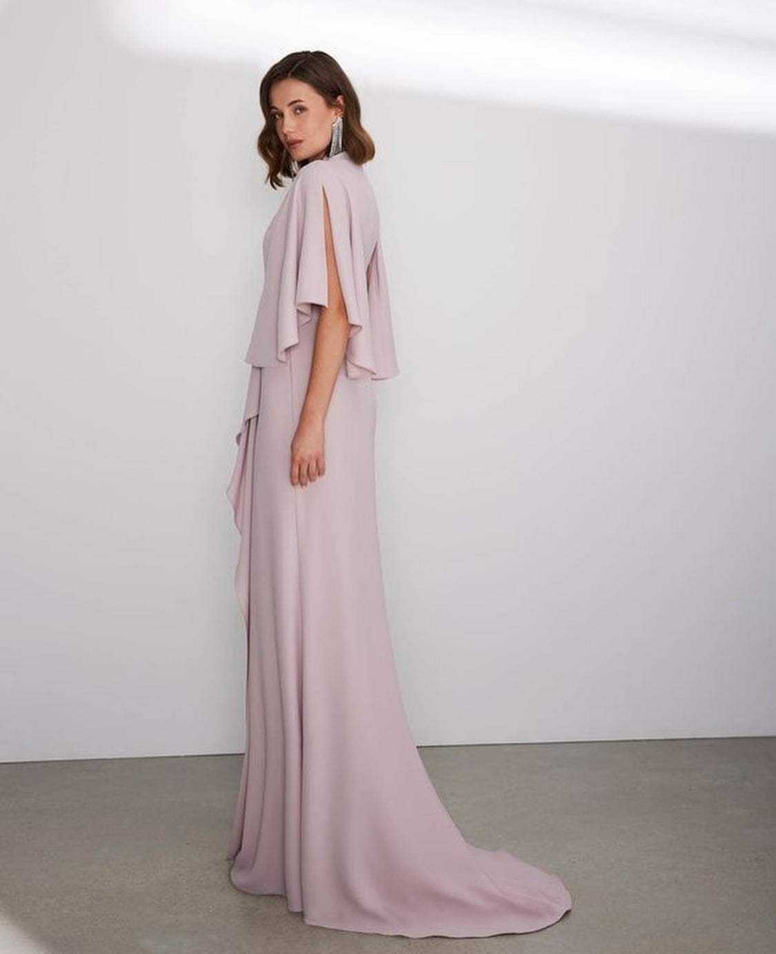 Exude sophistication in this fluid crepe evening dress by Rosa Clará . Featuring elegant cape sleeves , a split front skirt , and a sleek zip closure at the back , this gown combines modern style with timeless grace , making it perfect for any formal occasion .