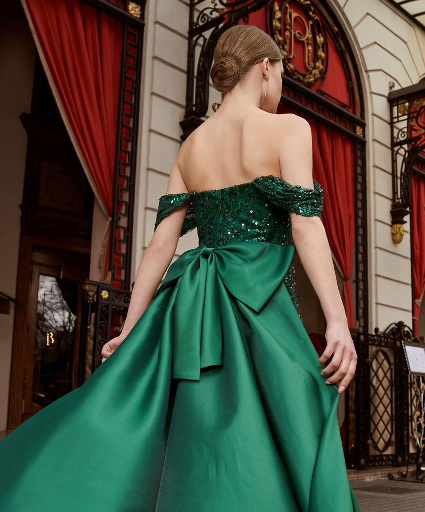 Dazzle in the spotlight with this breathtaking sequined mermaid dress by Martha Blanc. This show-stopping gown features shimmering sequins that hug your curves, creating a stunning silhouette. The detachable puffy sleeves add a touch of drama, while the optional back bow and sweeping train offer versatility and elegance, allowing you to customize your look for any grand occasion. Perfect for making a memorable entrance, this gown embodies glamour and sophistication.