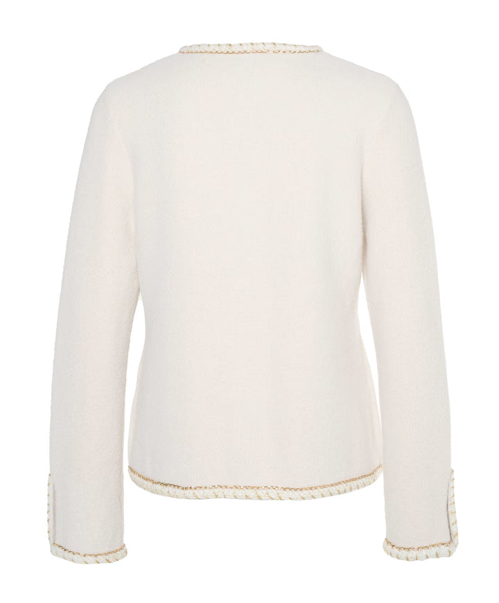 A refined layer with Parisian polish, the Leo & Ugo RH781 off whiteGold Detail Cardigan Jacket combines classic structure with ornate trim. Its braided accents and gold buttons elevate everyday styling with boutique precision.