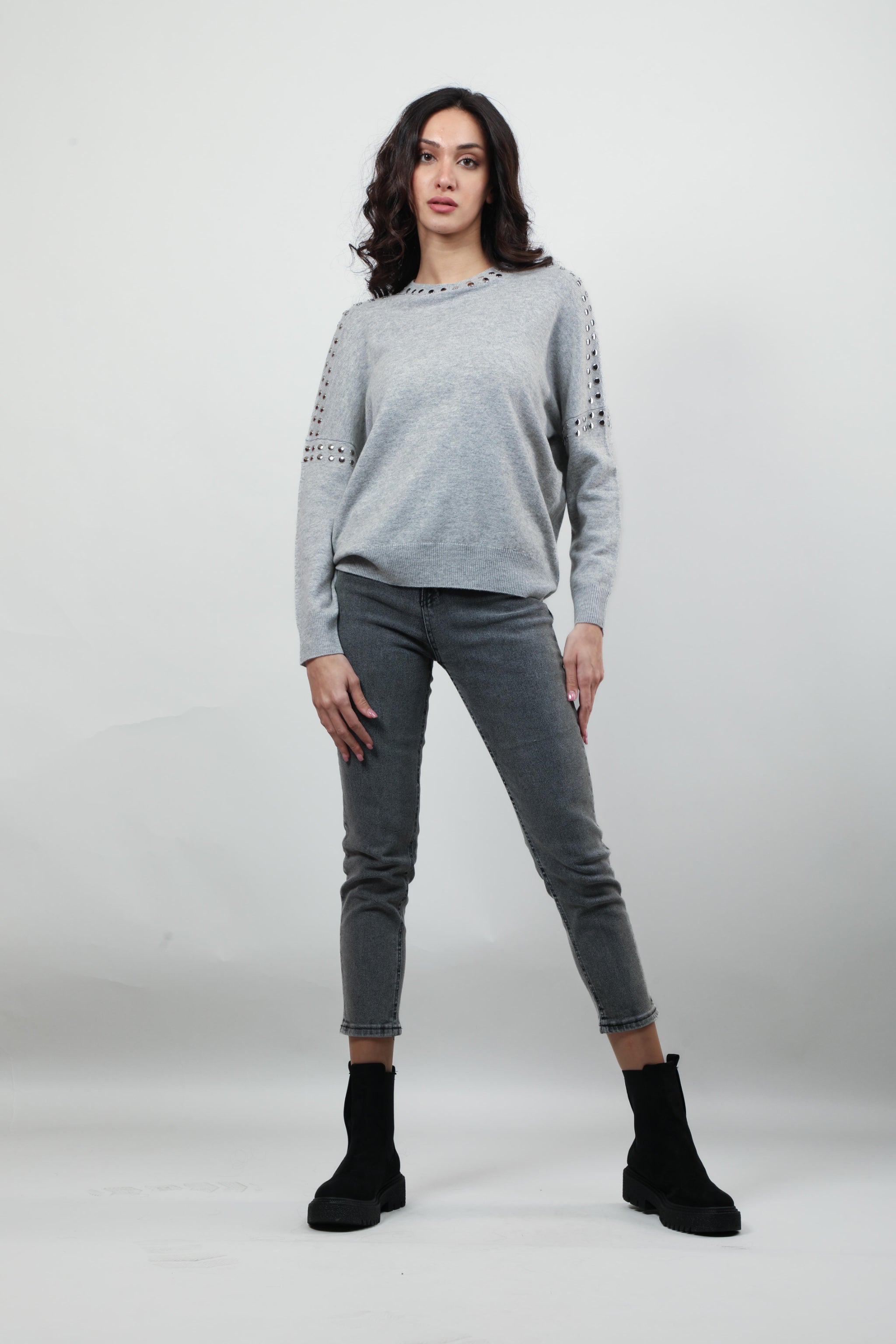 A contemporary gray sweater adorned with eye-catching metallic studs around the neckline and along strategic cut-outs on the sleeves. Crafted in a soft, cozy knit, it offers both comfort and a stylish edge. The relaxed fit pairs effortlessly with jeans or skirts, making this a versatile piece that easily transitions from daytime casual to a bolder evening look.
