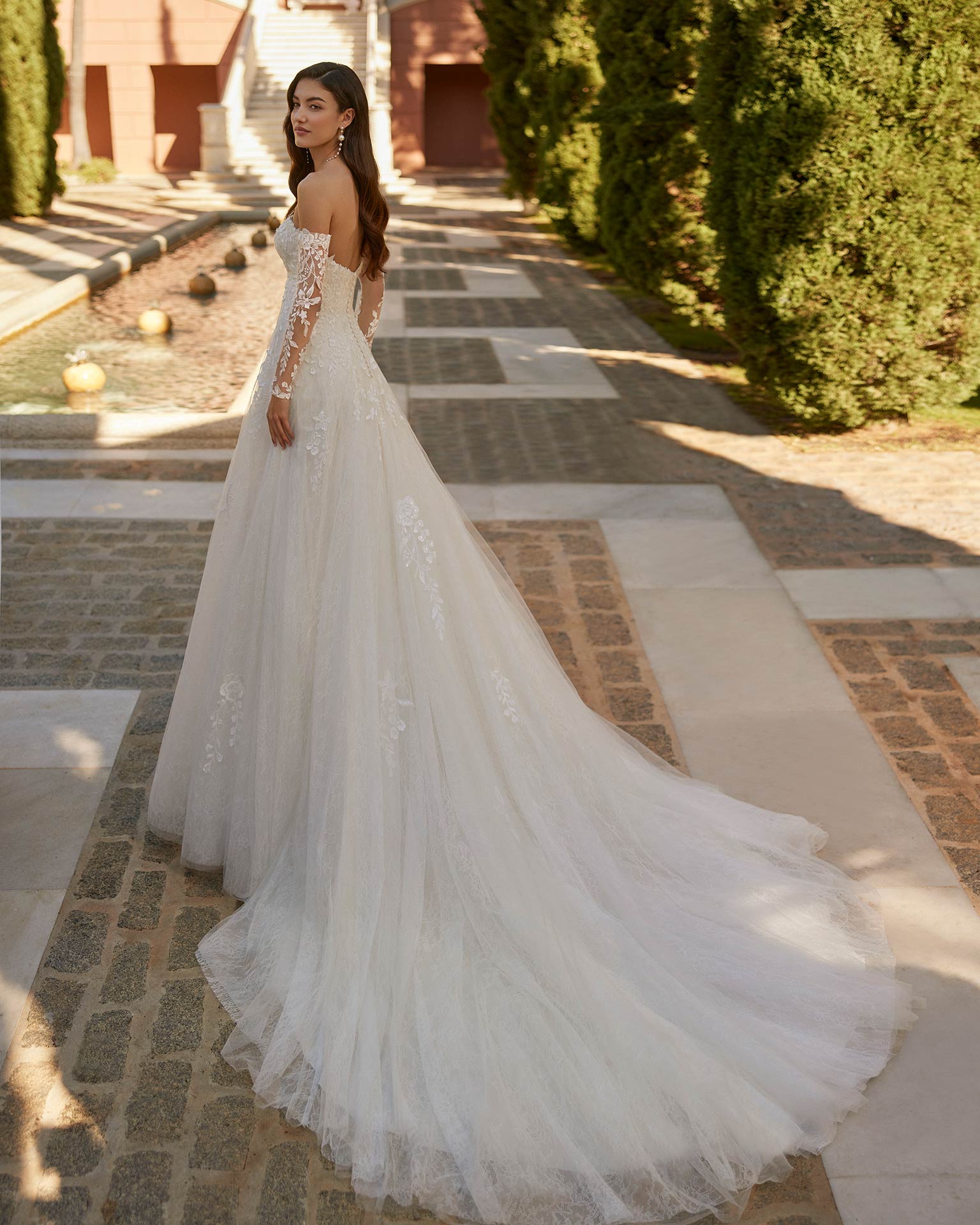 Long princess wedding dress, crafted in lace combined with tulle. Showcasing a strapless neckline, buttoned back and detachable sleeves.