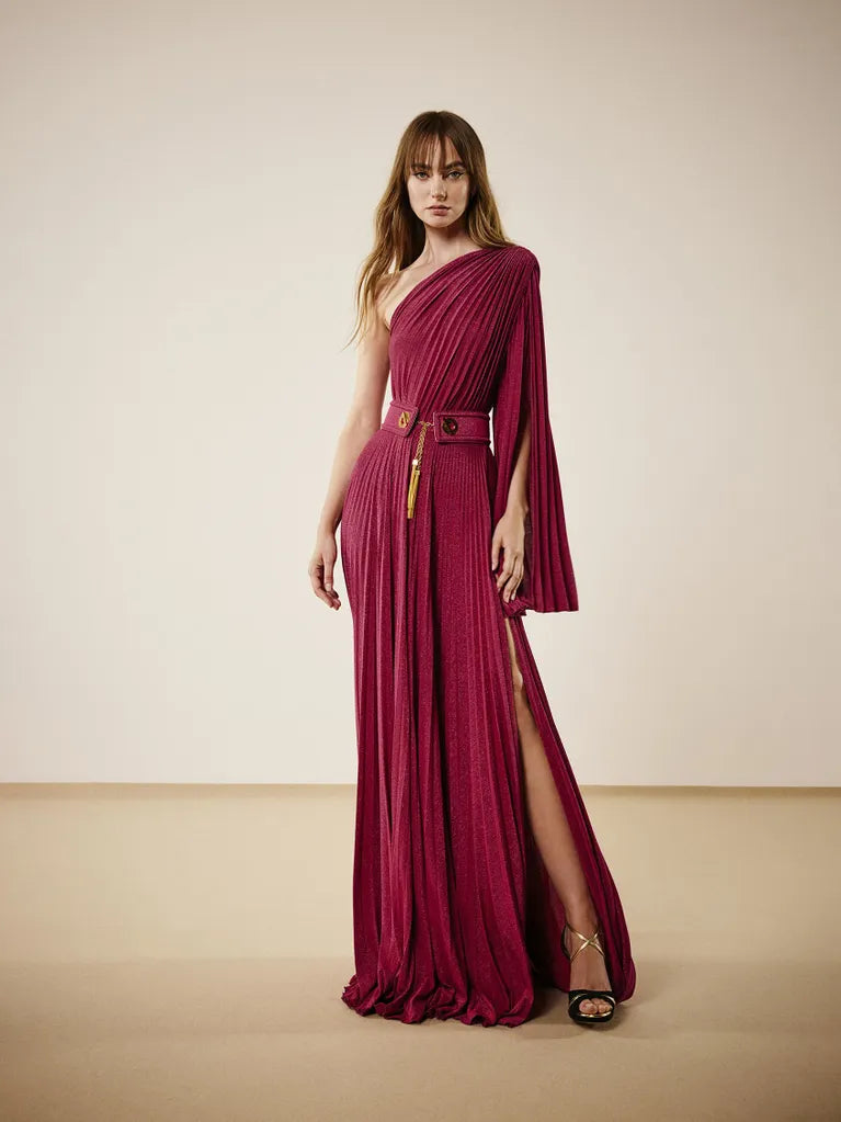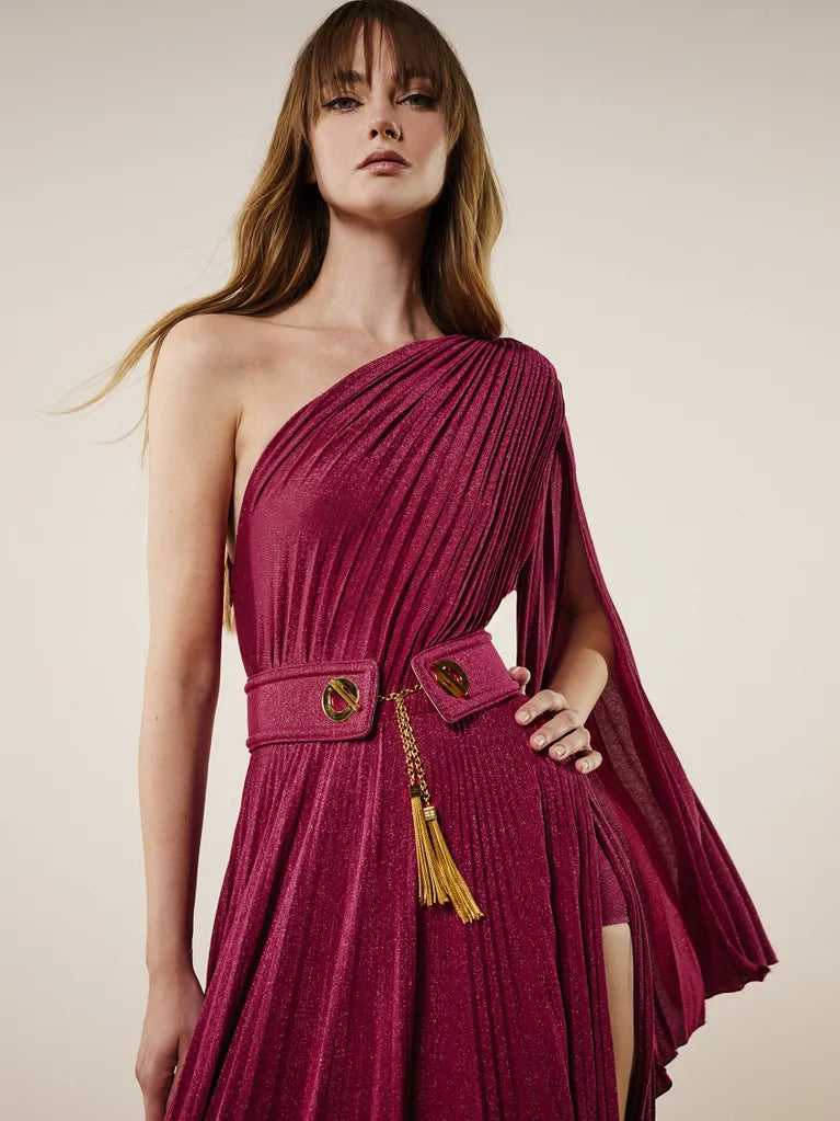 A-line cocktail dress with asymmetrical neckline and long sleeves