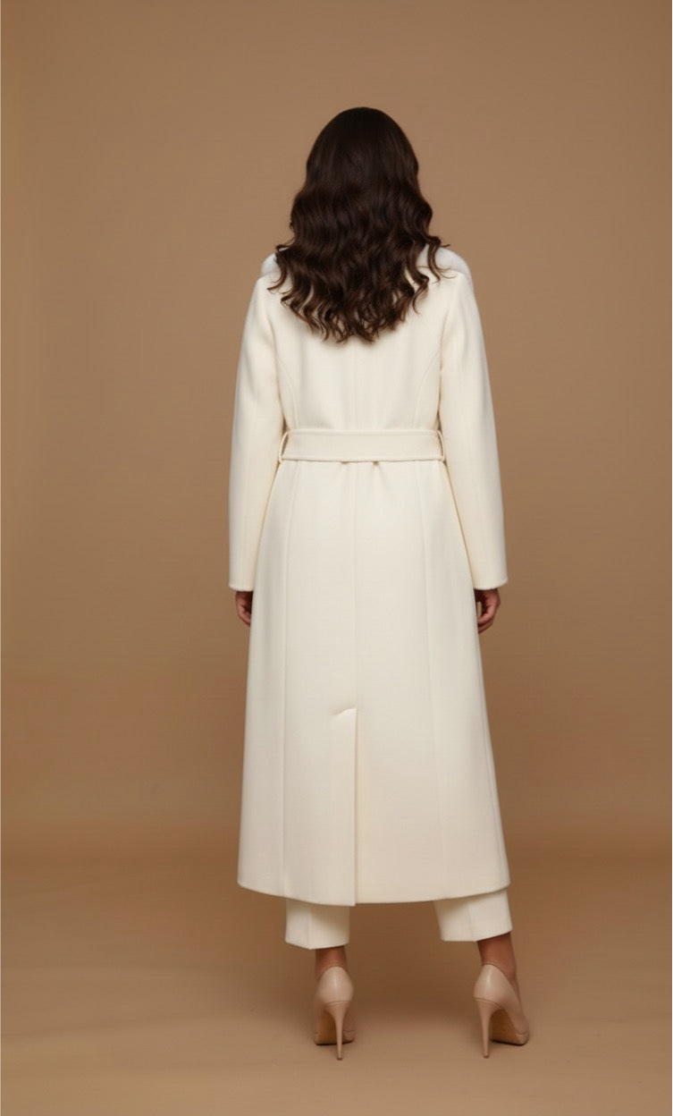 The Ivory Mink Faux Fur Trim Long Coat is a statement of luxurious elegance. Crafted with a rich, soft mink-inspired faux fur trim along the collar and front, this full-length coat exudes opulence while maintaining a refined, classic silhouette. The plush faux mink fur adds texture and warmth, complementing the sleek ivory fabric for a sophisticated contrast. Perfect for winter, this coat combines timeless style with modern chic, making it ideal for both formal occasions and upscale casual outings. Designed to keep you warm and effortlessly stylish, this coat is a stunning addition to any cold-weather wardrobe.
