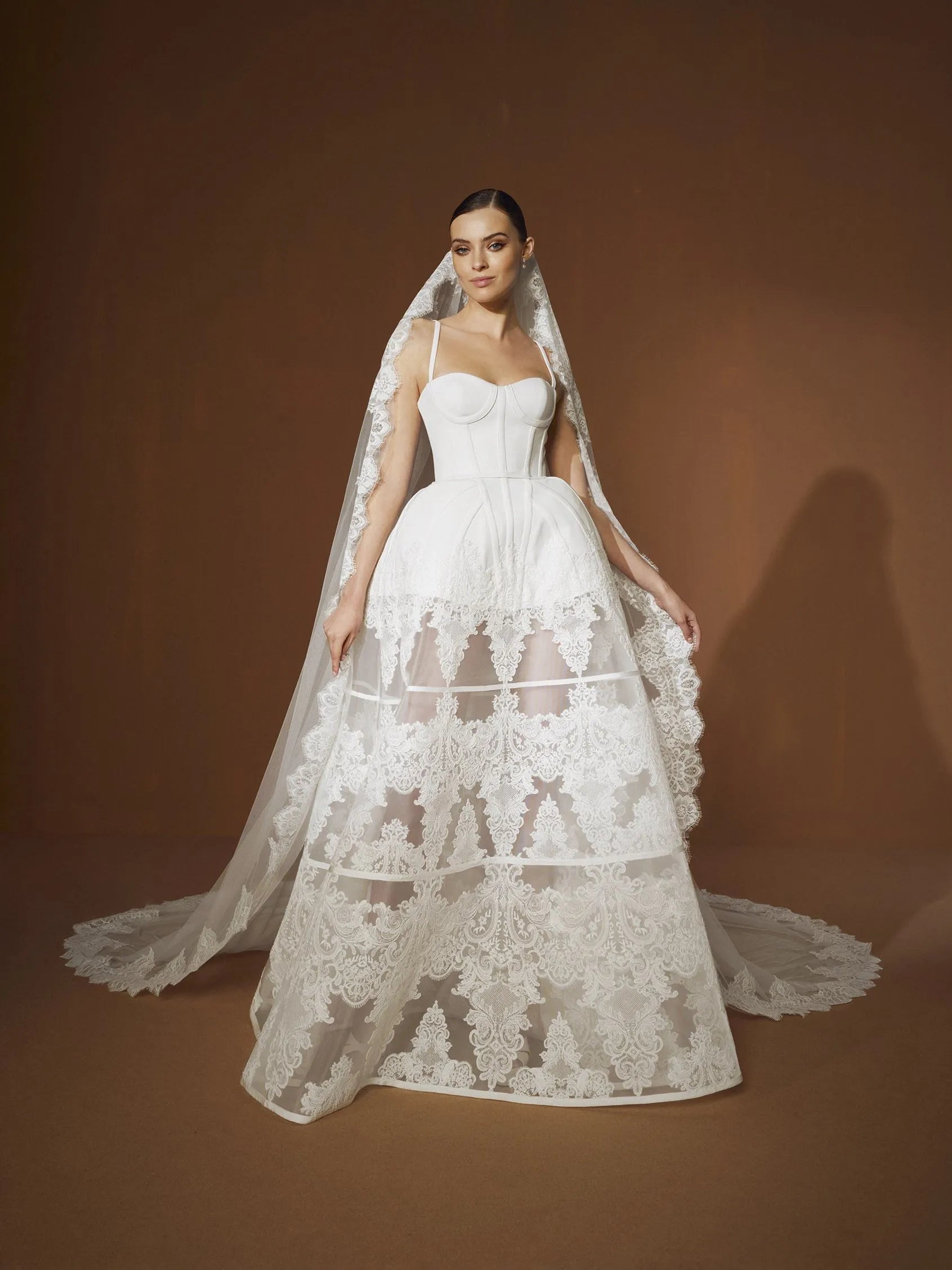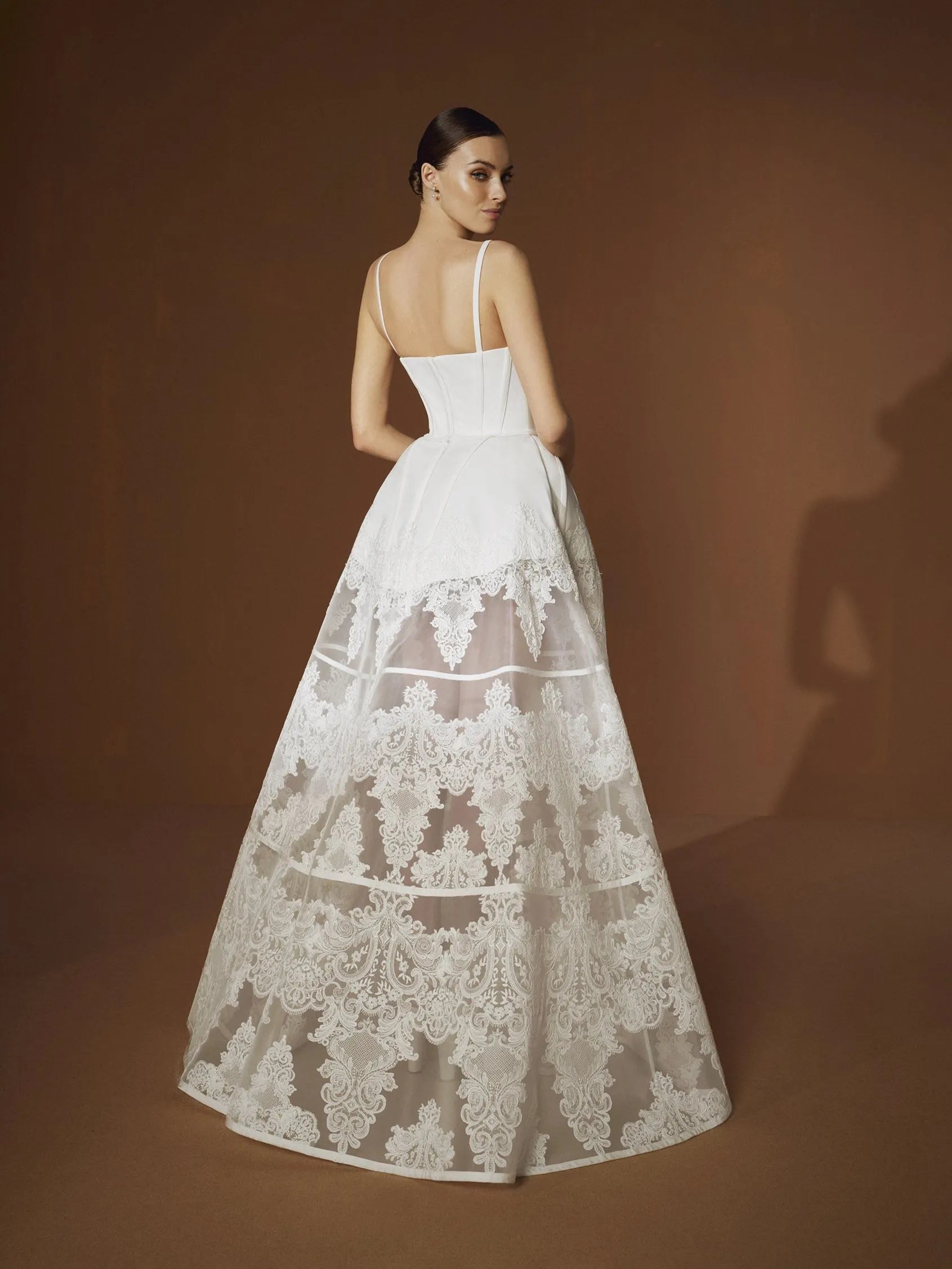 Let yourself be seduced by a winning mix: the lingerie inspiration of the bodice and the sweetness of sheer details, combined in this long model crafted in crepe. The sleeveless bodice has a beautiful sweetheart neckline and is fitted at the waist. The skirt, featuring the classic A-line cut, falls with a suggestive flounce and presents embroidered motifs on sheer fabric. Add a touch of romanticism with a lovely shimmering veil featuring lace trim.