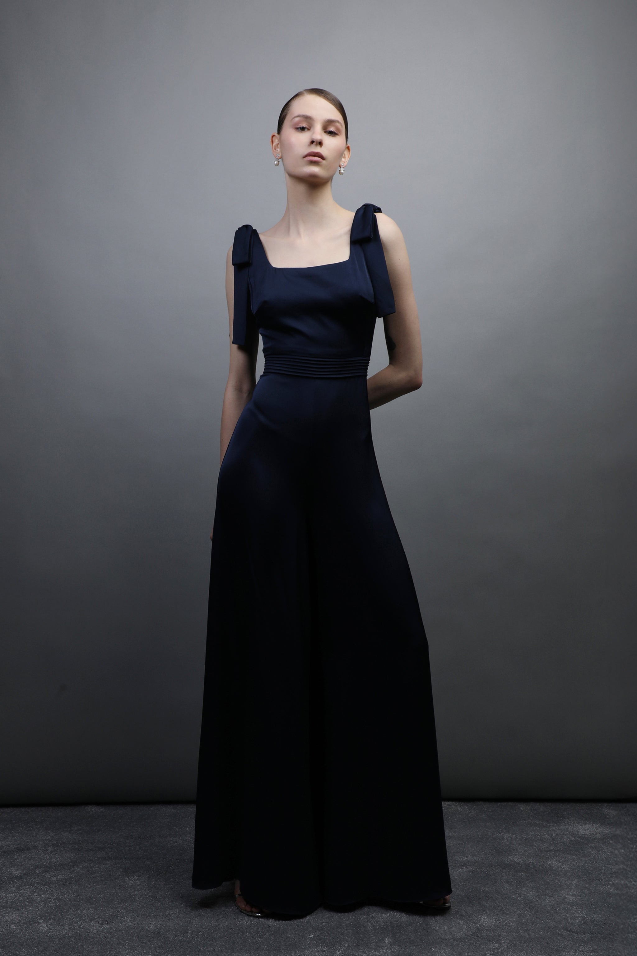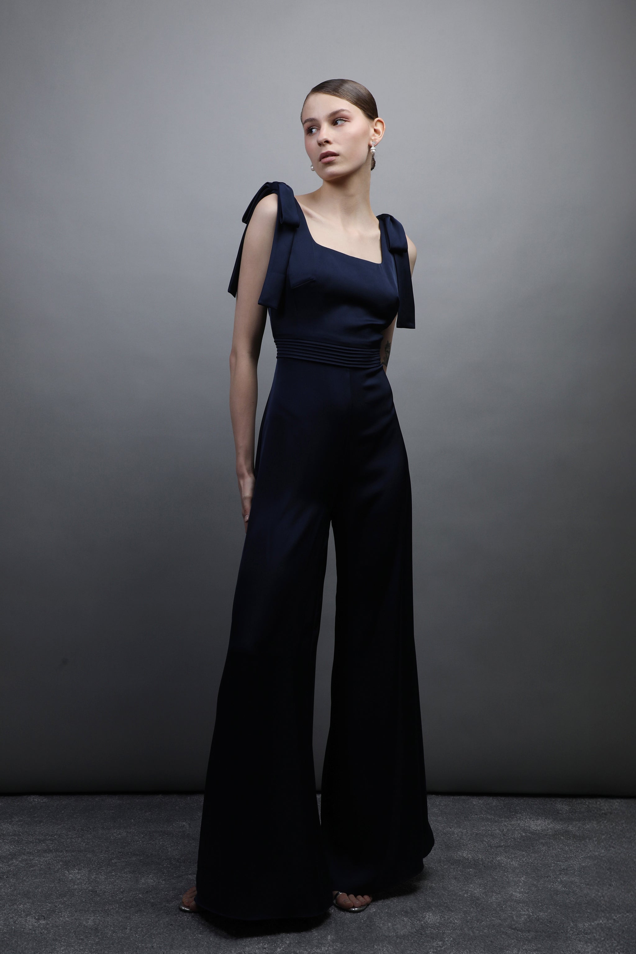 A refined navy jumpsuit featuring a structured bodice with a square neckline and delicate shoulder tie details. The fitted waistline accentuates the silhouette, while the wide-leg trousers create a fluid, elongating effect. The minimalist yet sophisticated design makes it a versatile statement piece for both formal and evening wear.