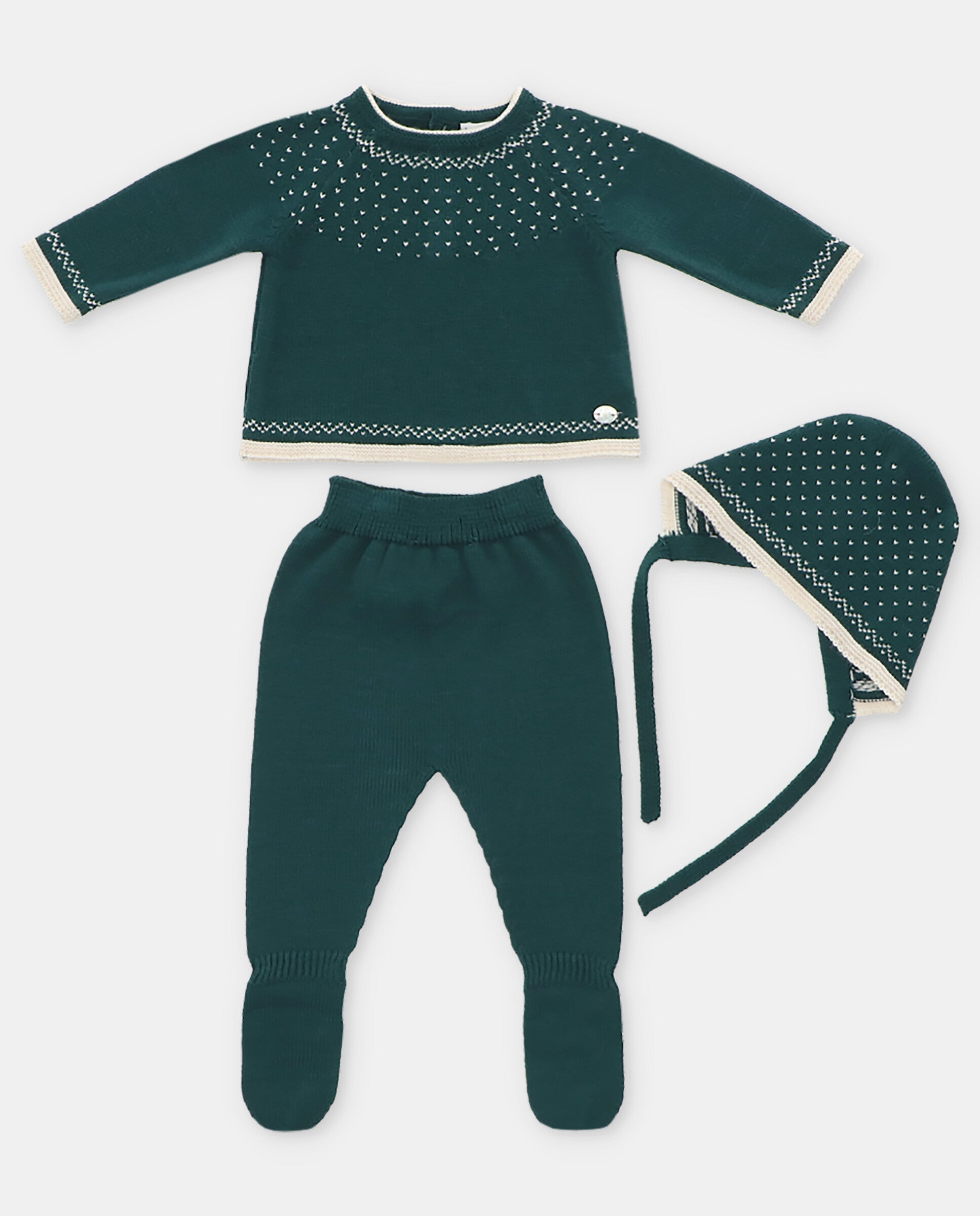 Bundle up your little dude with this adorable 3-piece knitted set! Perfect for chilly days, this set includes cozy leggings, a stylish sweater, and a cute bonnet for his head. Keep him warm and looking cool at the same time. (So punny!)