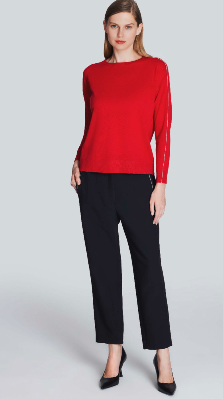 This knitwear sweater features a sleek and modern design, highlighted by a thin contrasting stripe running along the length of the arms. Crafted from soft, breathable fabric, it offers a comfortable fit with a touch of elegance. The subtle arm detailing adds a unique and stylish element to the classic sweater silhouette, making it perfect for both casual and semi-formal wear. With its versatile style, this sweater can be effortlessly paired with jeans or tailored trousers, making it a staple piece for any wardrobe.