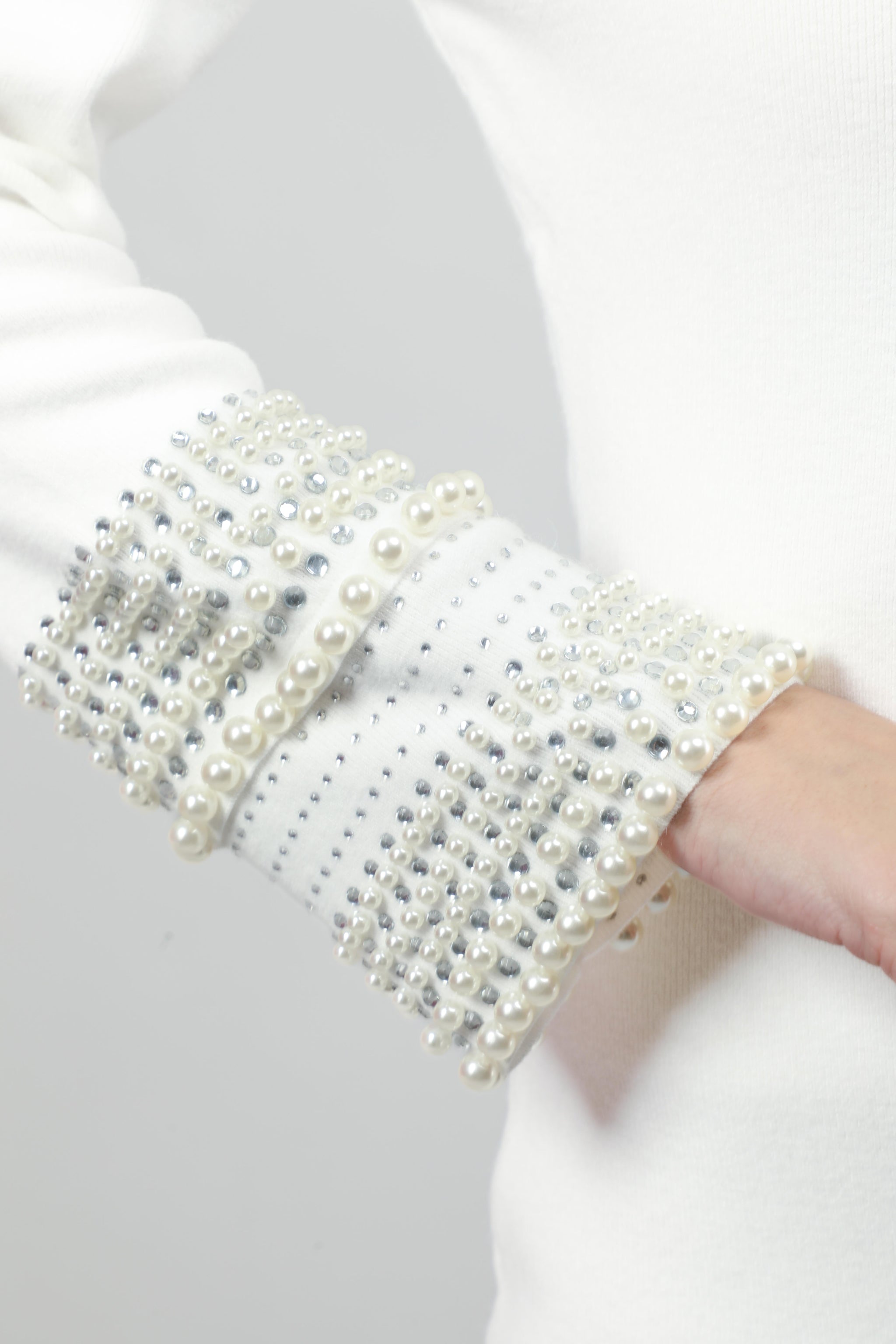 Elevate your look with this elegant black sweater featuring a flattering V-neckline and jaw-dropping, pearl-encrusted cuffs. Rows of lustrous pearls and shimmering crystals create a dramatic embellishment that sets this piece apart. Crafted in a soft knit for all-day comfort, it pairs effortlessly with sleek trousers or a pencil skirt for a sophisticated evening or special-occasion ensemble.