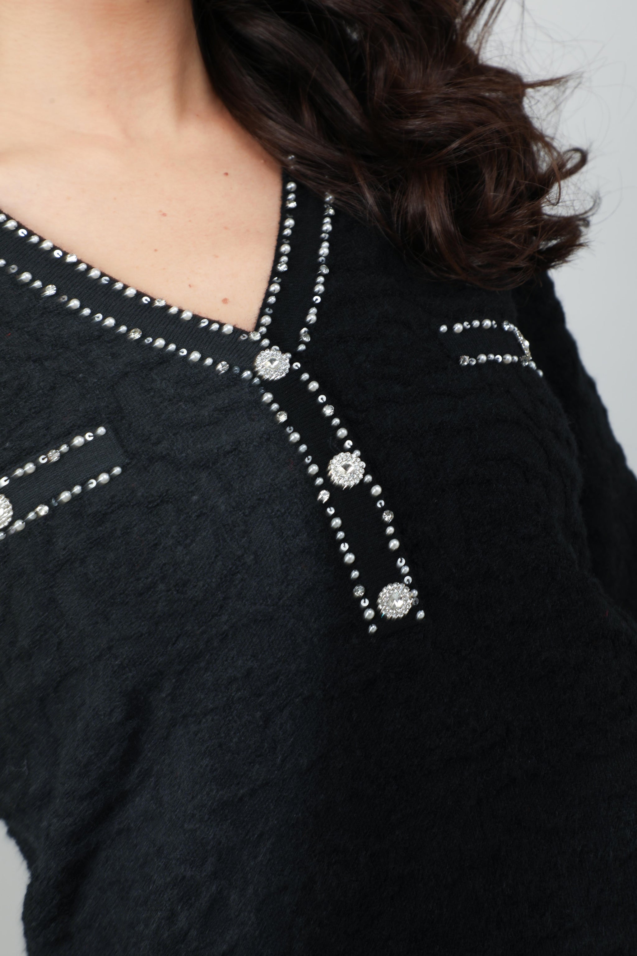 A refined ivory sweater featuring a textured black tweed trim along the V-neckline, adding modern contrast to its classic silhouette. Coordinating tweed accents on the chest are embellished with sparkling buttons, offering a hint of glamour. The soft knit fabric and long sleeves ensure a comfortable fit, making this piece ideal for both elevated daytime looks and sophisticated evening outfits.