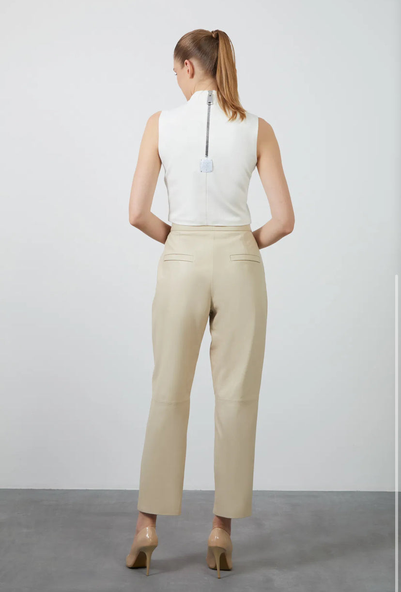 The Leather Trousers with Front Stitching Detail are a bold and stylish addition to any wardrobe. Made from premium leather, these trousers feature a sleek, fitted silhouette that hugs the figure while providing a comfortable fit. The standout element is the front stitching detail, which adds a subtle yet eye-catching accent, enhancing the tailored look. With a mid to high-rise waist and a smooth finish, these trousers are versatile enough to be dressed up with heels or paired with boots for a more edgy, casual vibe. Perfect for adding a touch of modern sophistication to any outfit, they offer a timeless yet contemporary appeal.